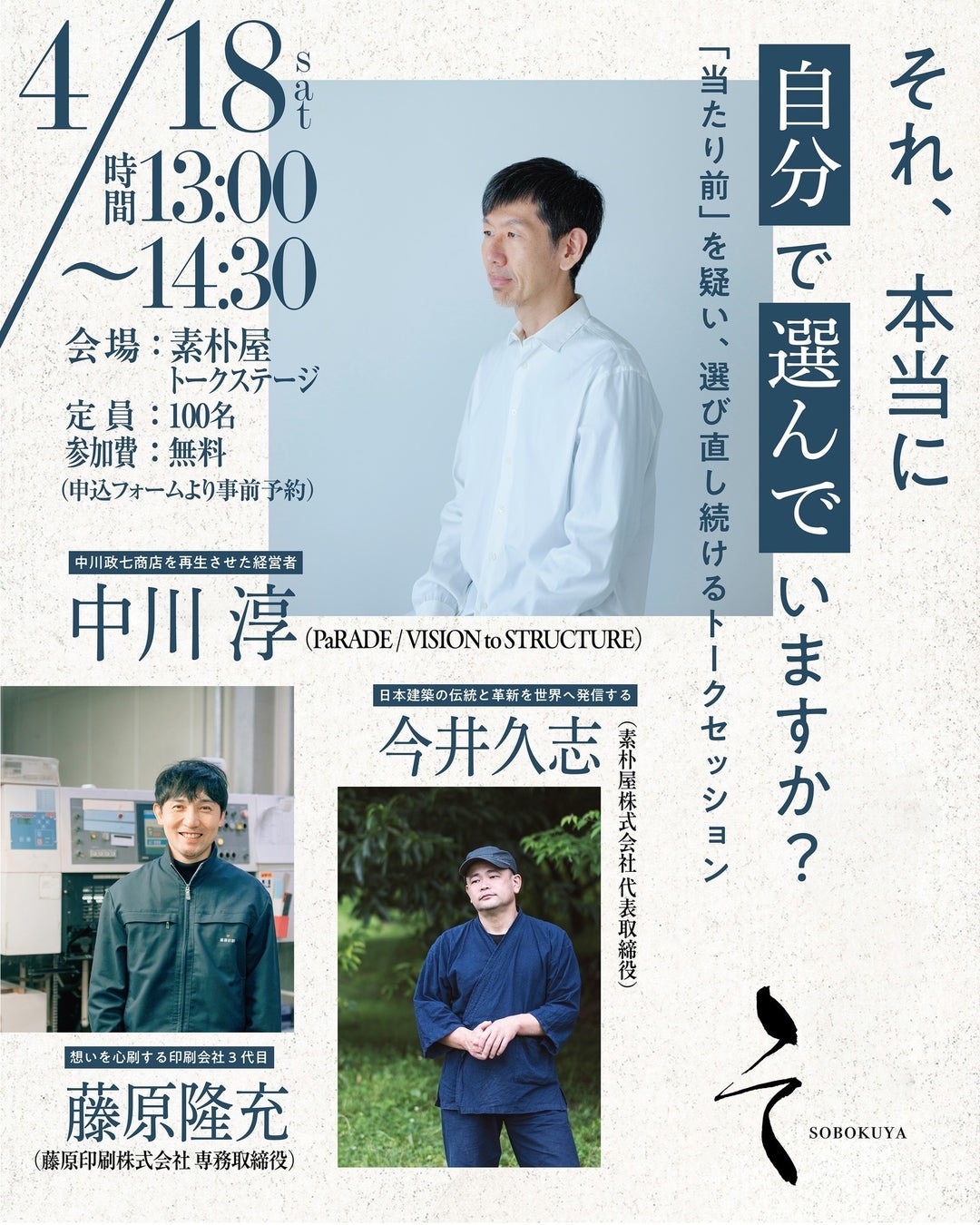 ファシリテーターにお迎えするのは、とことん親身に本づくりや印刷の相談に乗ってくれることで知られる長野県松本市の印刷会社・藤原印刷から 藤原隆充さんです。皆さまに目にしていただく素朴屋の印刷物はすべて藤原印刷さんに「心刷」していただいています。