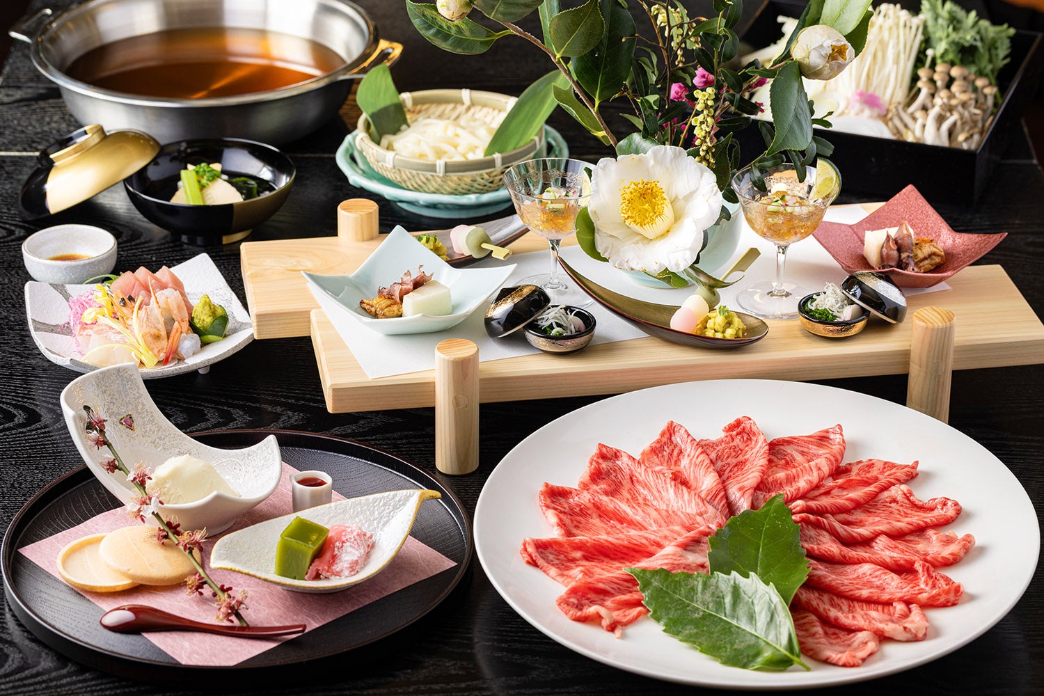 ご夕食には、メインに鹿児島県産A5ランク黒毛和牛によるすきやき、またはしゃぶしゃぶからお好みで選べる季節の和会席をご用意いたします。また、お料理に合わせて厳選した地酒やウイスキー、ワインなどのアルコールも豊富にラインナップ。季節それぞれのマリアージュに舌鼓を打つ、上質なディナータイムをご堪能ください。
