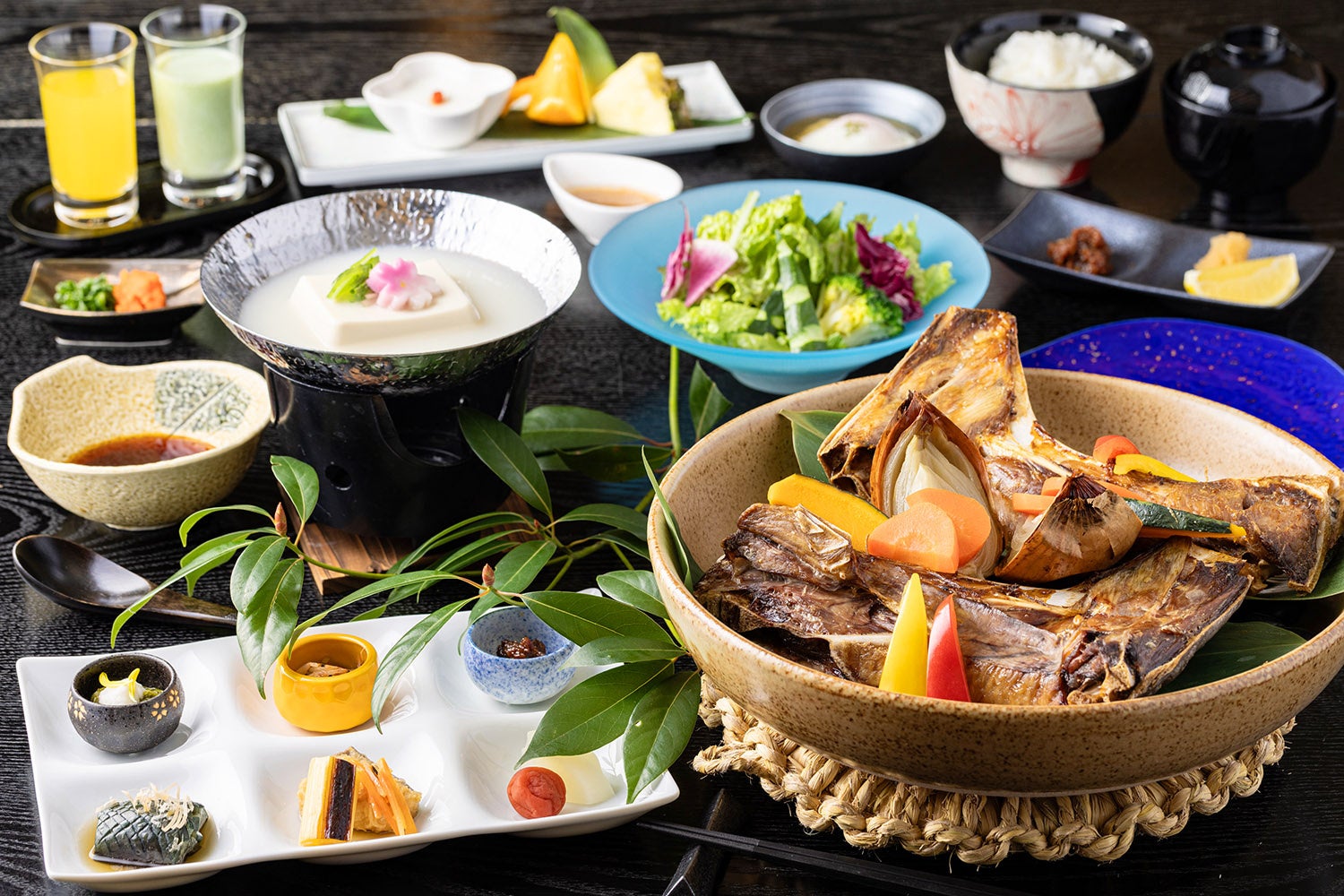 ご夕食には、メインに鹿児島県産A5ランク黒毛和牛によるすきやき、またはしゃぶしゃぶからお好みで選べる季節の和会席をご用意いたします。また、お料理に合わせて厳選した地酒やウイスキー、ワインなどのアルコールも豊富にラインナップ。季節それぞれのマリアージュに舌鼓を打つ、上質なディナータイムをご堪能ください。