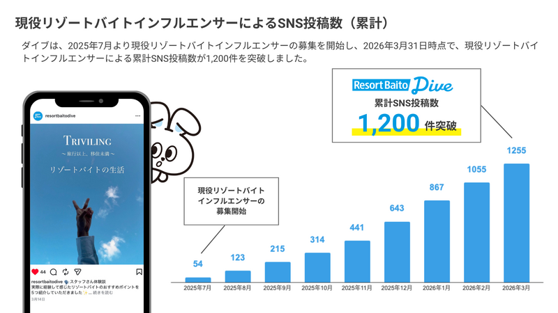 この度、リゾートバイトダイブは2025年7月より募集を開始したインフルエンサー制度において、現役リゾートバイトインフルエンサーによるSNS投稿数が累計1,200件を突破したことをお知らせいたします。あわせて、在籍する現役リゾートバイトインフルエンサー数も300名を突破いたしました。
