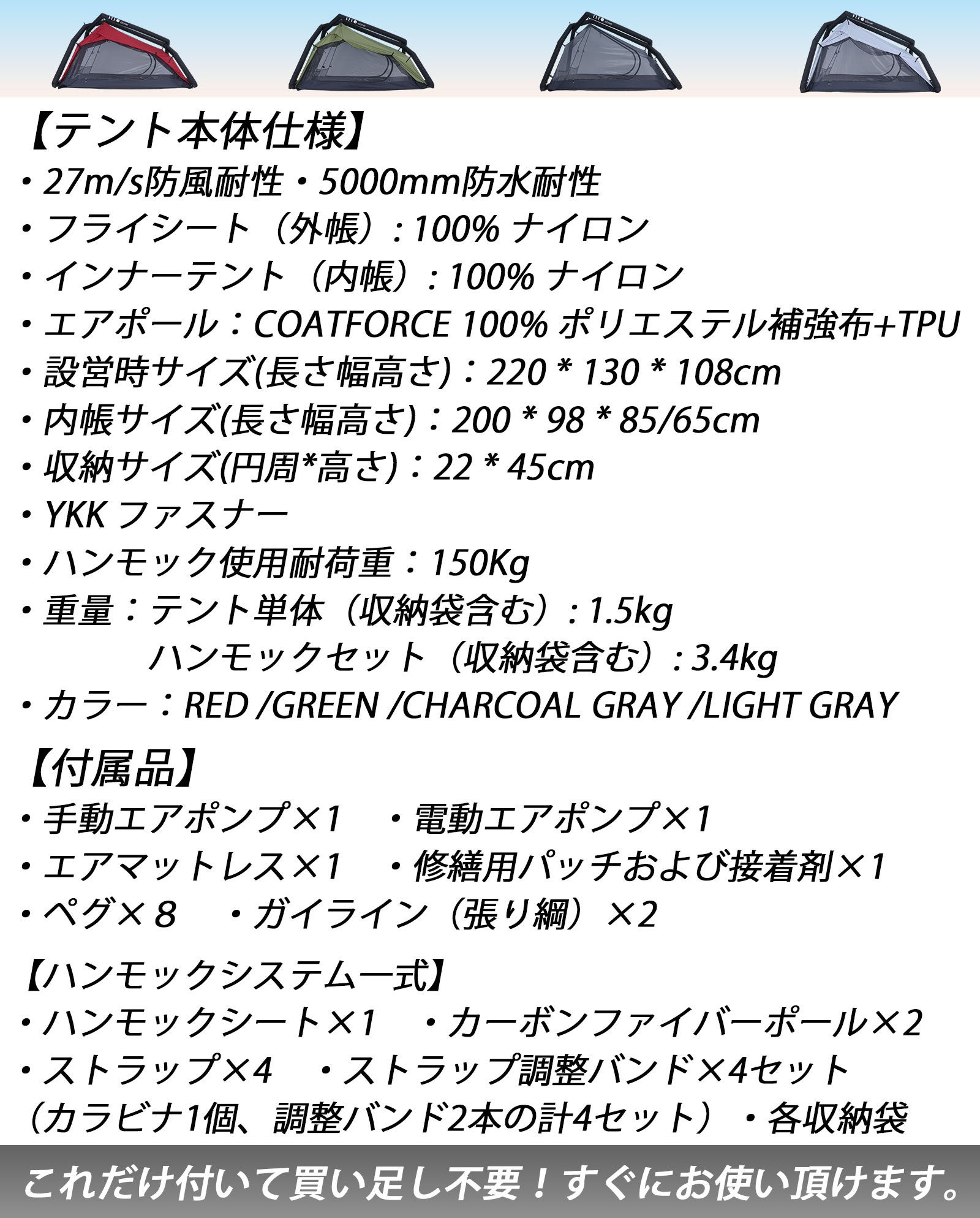【aloner】は地上テント、ハンモックテント、電動エアポンプ、エアマットと本来全て揃えると大荷物でコストも掛かるところを、一つにギュッとまとめたお得で高級テントに負けないスペックを維持したオールインワンソロテントです。