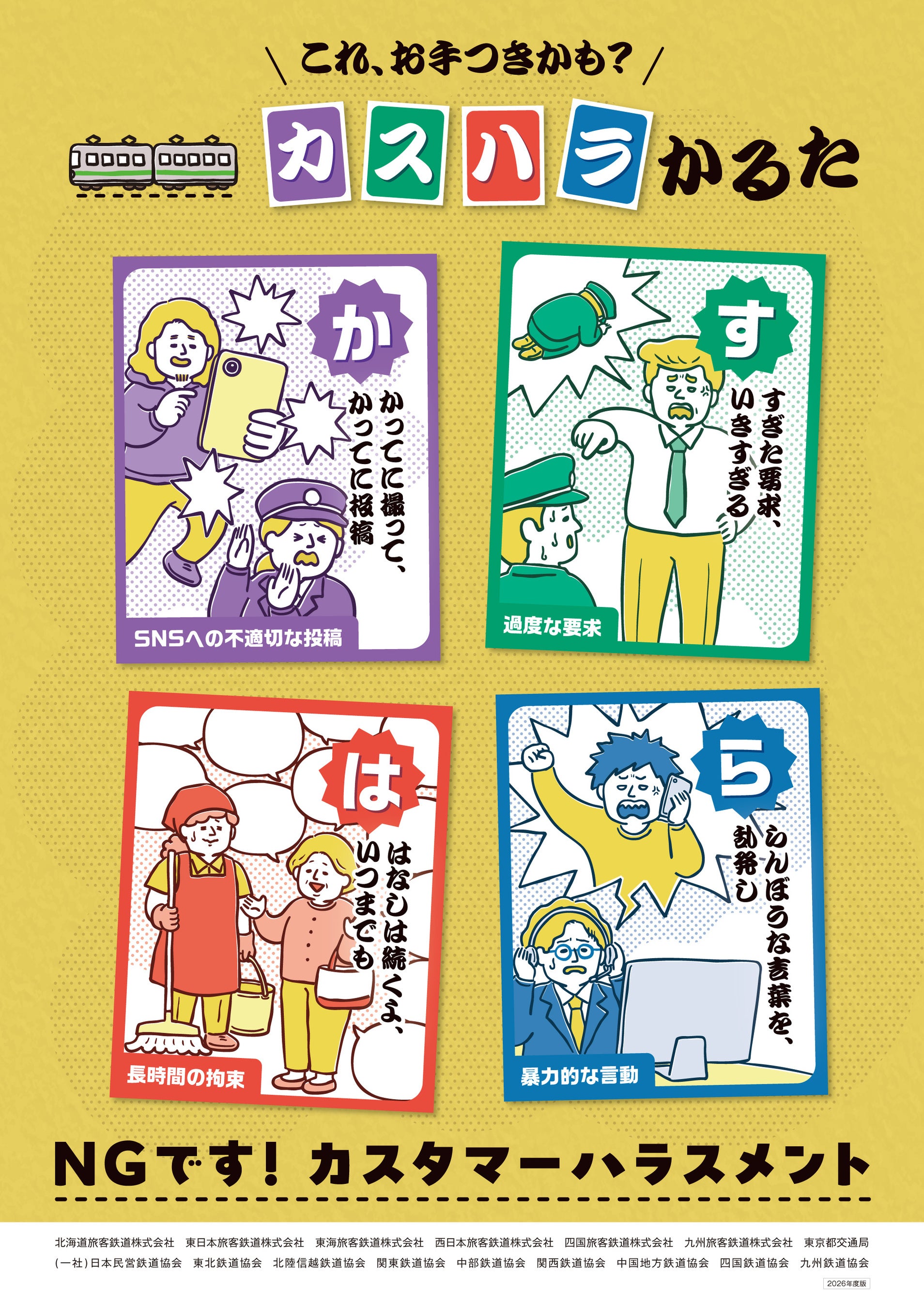 〇鉄道事業者各社局と各鉄道協会は、この度一体となってカスタマーハラスメント対策に取り組むべく、カスタマーハラスメント(以下、「カスハラ」という。)の防止に向けた啓発ポスターの掲出を実施いたします。
