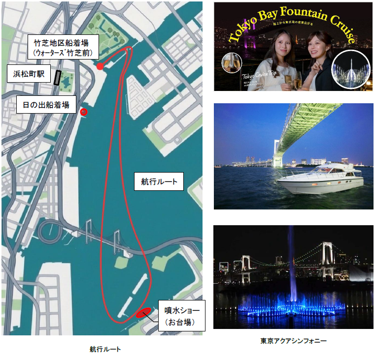 東京都が2026年3月に開始したお台場海浜公園の新たなランドマークとなる噴水「東京アクアシンフォニー」※への協賛実施や、それと連動したクルーズ施策の実施などを通じて、竹芝やお台場を中心に東京ベイエリアをつなぎ、にぎわい創出やナイトタイムエコノミー推進に寄与してまいります。
