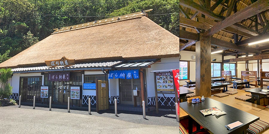 「ぼら納屋(ぼらなや)」は、歴史と城ヶ崎海岸の絶景、新鮮な海の幸が一度に楽しめる和食処。江戸時代に建築され、ボラ漁を操業する漁師の作業小屋だった茅葺き屋根の建物は、今年で築400年(寛永3年/1626年~)に。