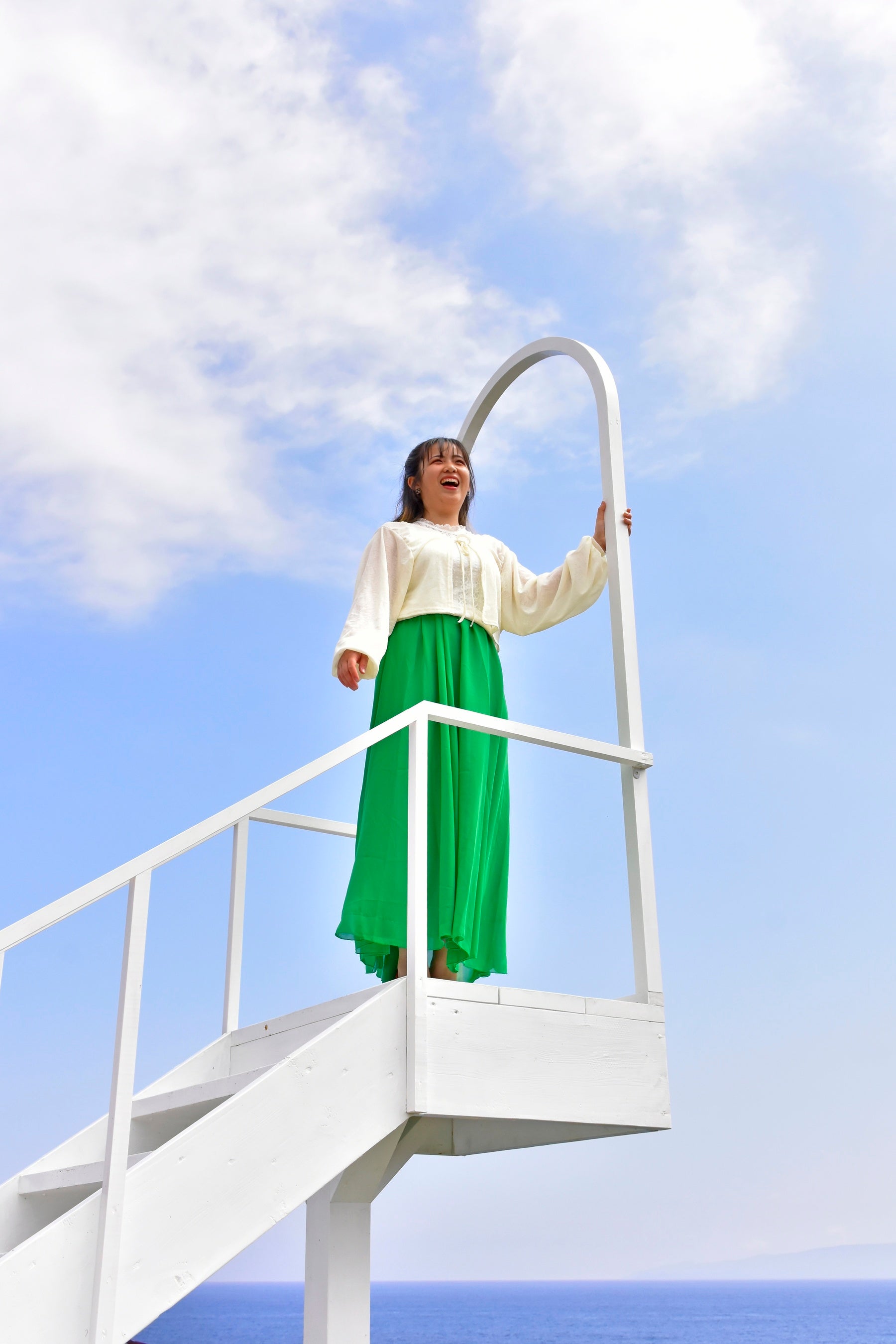 青い空と海に向かって伸びる白い階段はフォトジェニック間違いなし。最上段のステップは地上2.5m、さらにその下は…城ヶ崎海岸の断崖絶壁!スリルも満点。