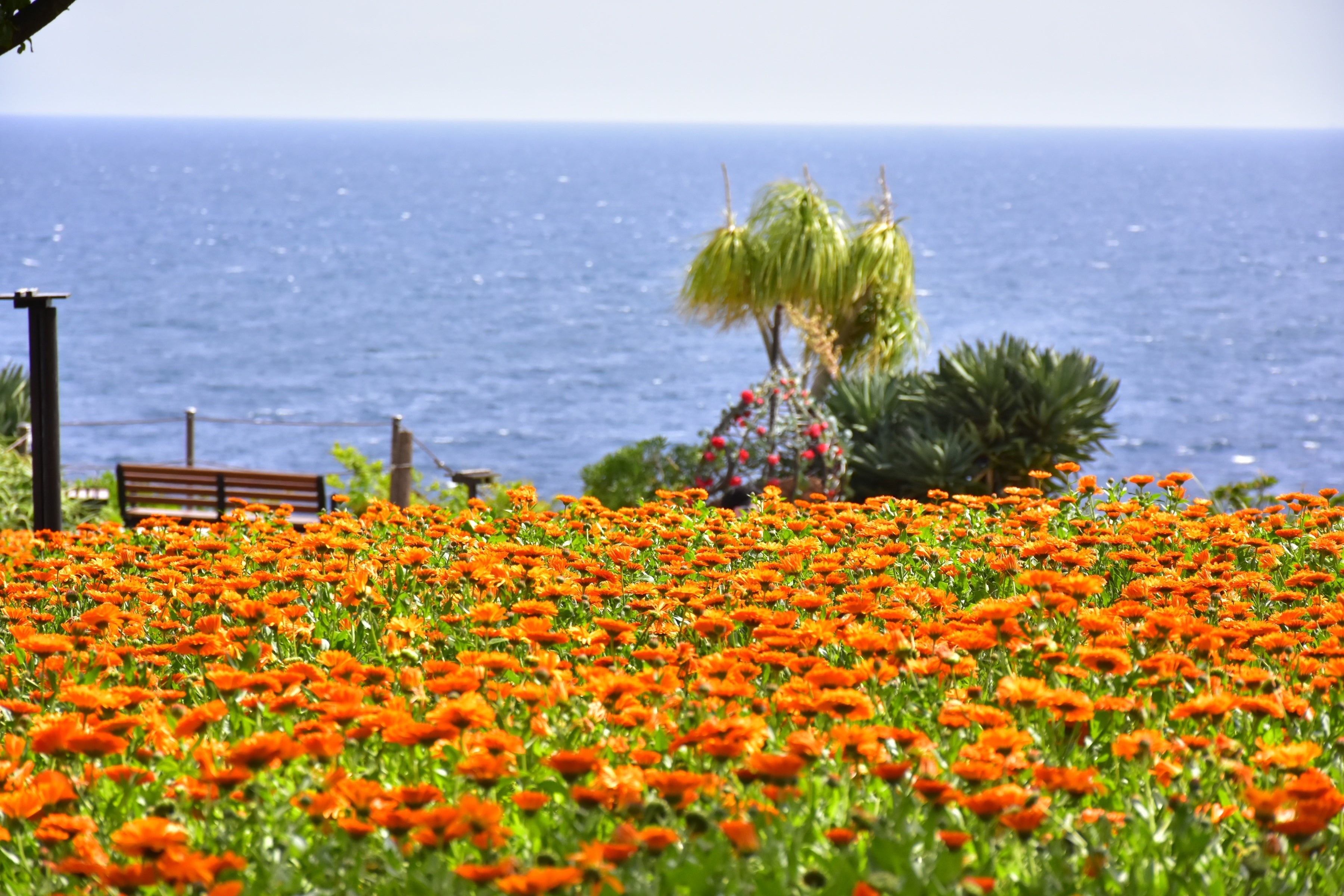 昨年、2025年春から岬付近の花畑に植栽を始めたカレンデュラが今年も見頃に!春のフラワーガーデンを鮮やかなオレンジ色が彩る♪