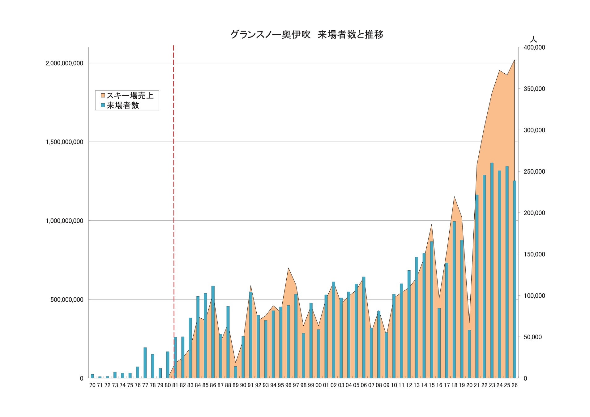 スキー場産業全体として、スキー・スノーボード人口が1800万人と最盛期を迎えた1998年当時のグランスノー奥伊吹(旧:奥伊吹スキー場)の売上高「3億3300万円」(入場者数5万4400人)から比較して、今季は「約6倍」となる「20億2000万円」(入場者数約4.5倍の23万8676人)まで増加しており、近年の「施設全体の魅力アップの為の積極的な設備投資」、「人工降雪機、人工造雪機」での雪造りを中心とした「暖冬、雪不足対策と安定した積雪量の確保」が大きく実を結び素晴らしい好況を実現しています。