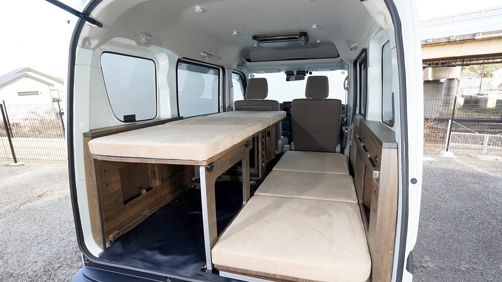高効率な空間設計: 独自のレイアウトにより、レジャー用品やキャンプ用品などの大きな荷物を積んだまま、大人2人が就寝可能なスペースを確保しました。