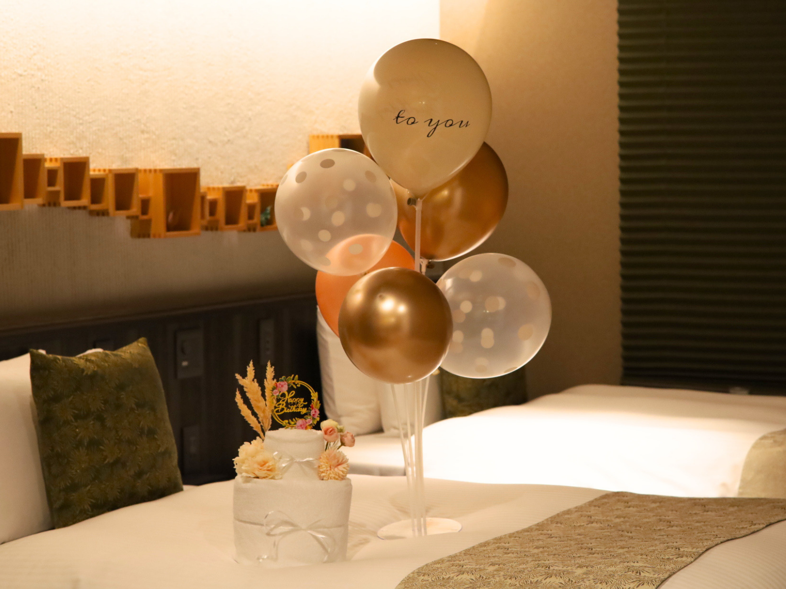 宿泊プランにプラスして、バルーン装飾とタオルアートで客室を華やかに演出。誕生日や推し活など幅広いシーンに寄り添う特別オプションです。