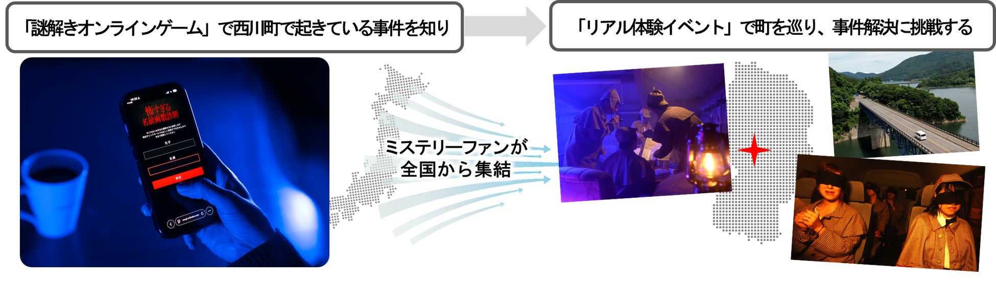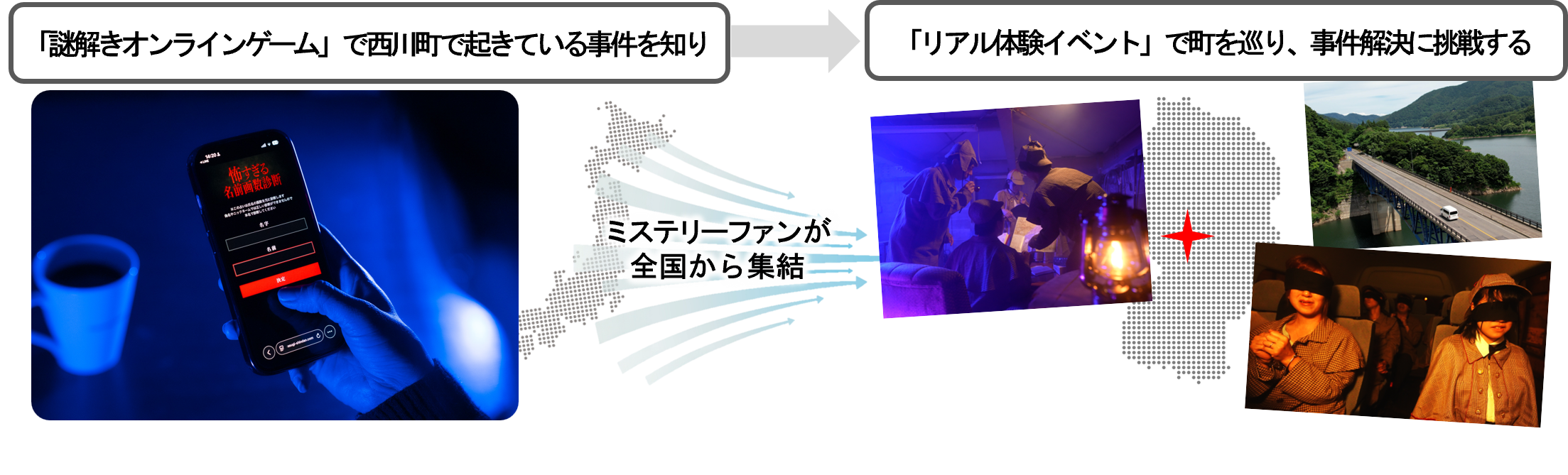 オンラインゲームをクリアした者だけが挑戦できる体験型ミステリーイベントでは、参加者は特製の探偵衣装を着用。ガイドと共にバスで町を巡り、プロの俳優や西川町民が出演したドラマ映像、岡本信彦氏のボイスキャストを頼りに事件解決に挑みます。