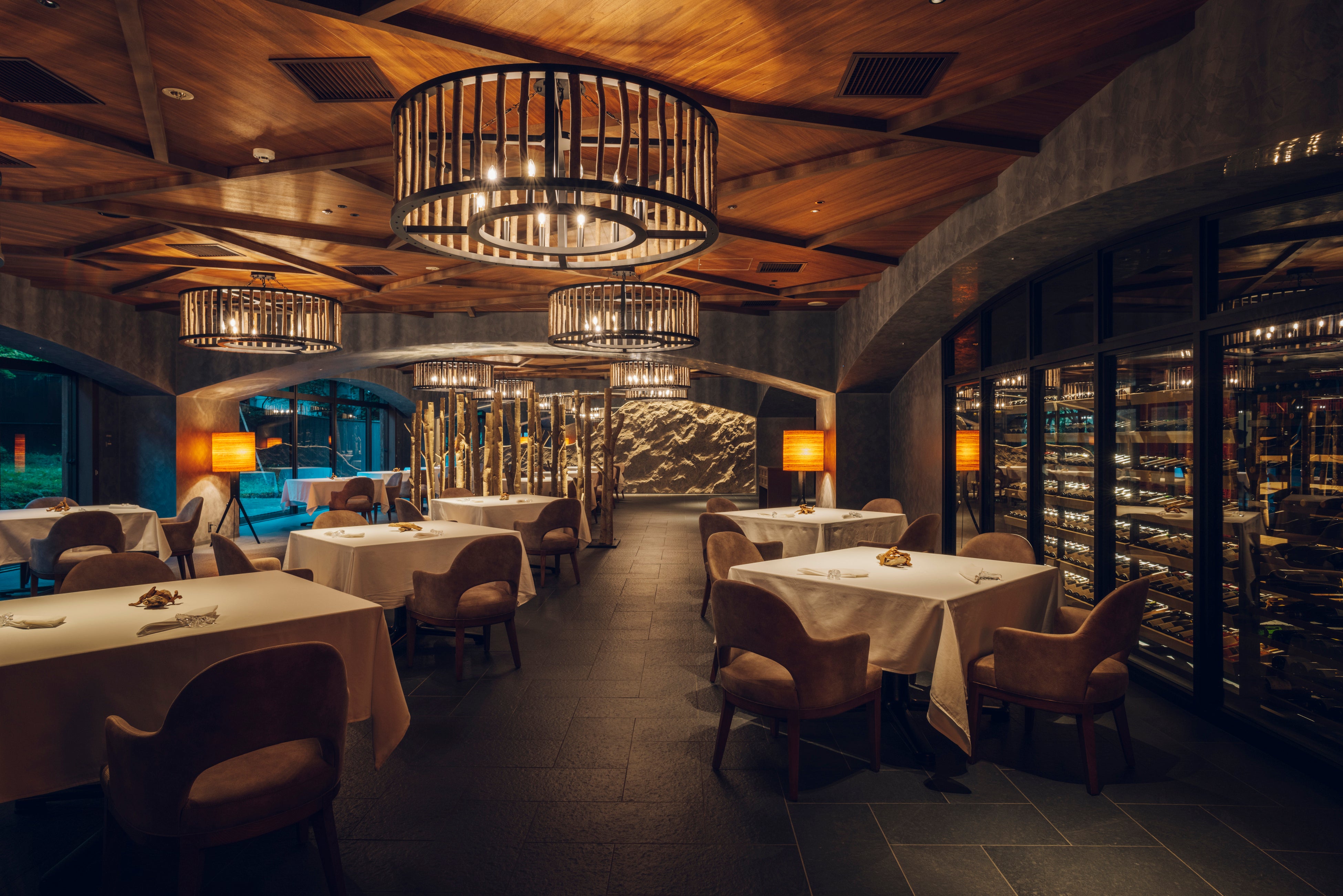 奥入瀬渓流の自然を感じられるテラス席と、大きな窓を設えたダイニング。2つの空間で、四季折々の大自然に癒されながら優雅な時間を過ごせます。開放的な渓流沿いのテラス席では、心地よい瀬音に包まれながらアペリティフを。移りゆく季節を眺めながら、アミューズとシャンパーニュを味わう時間は、この上ない贅沢です。その後は落ち着いたダイニングへと席を移し、窓外の自然美とともにゆっくりと食事を堪能する、特別なひとときを提供します。