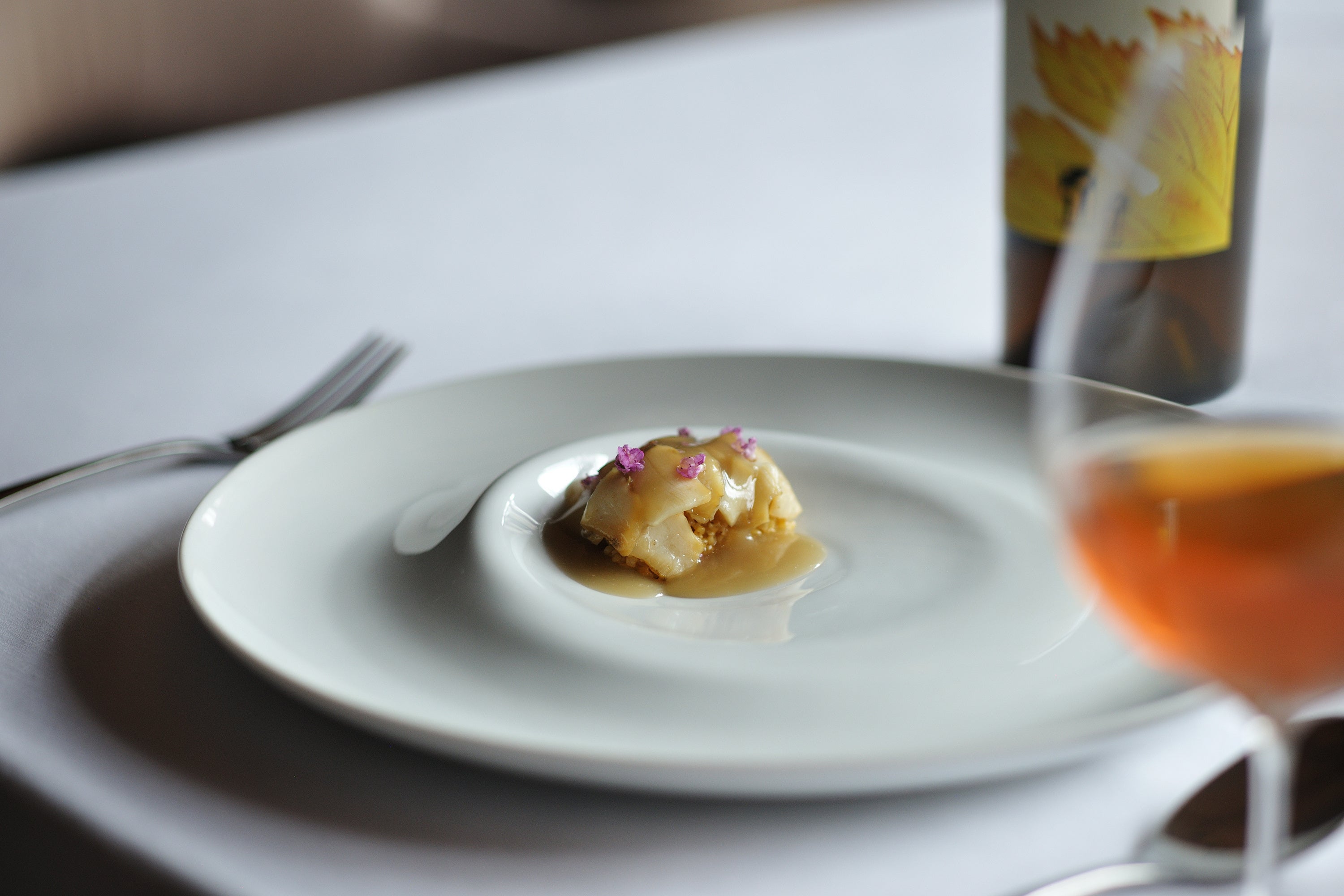 香ばしく焼き上げた鴨肉と牛蒡の温前菜に合わせるのは、農薬や化学肥料を使わず、鍬で耕し手摘みで収穫されたピノ・ノワールから造られる赤ワイン「コート・ド・ニュイ・ヴィラージュ」。枯れ感や土、醤油、チョコレートを思わせる複雑な熟成香が、鴨肉の強い旨味を引き立てます。引き締まったワインの輪郭と牛蒡の香りと食感が調和し、奥深いマリアージュを満喫できる一皿です