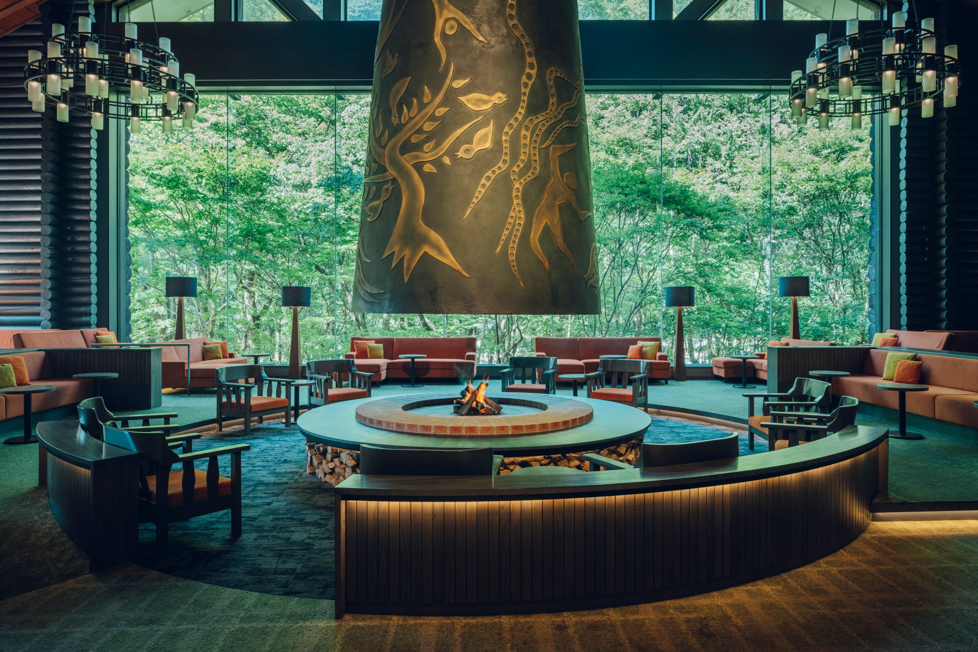巨大暖炉が印象的なロビーが癒しの空間を醸し出します。「渓流スローライフ」をコンセプトに心から