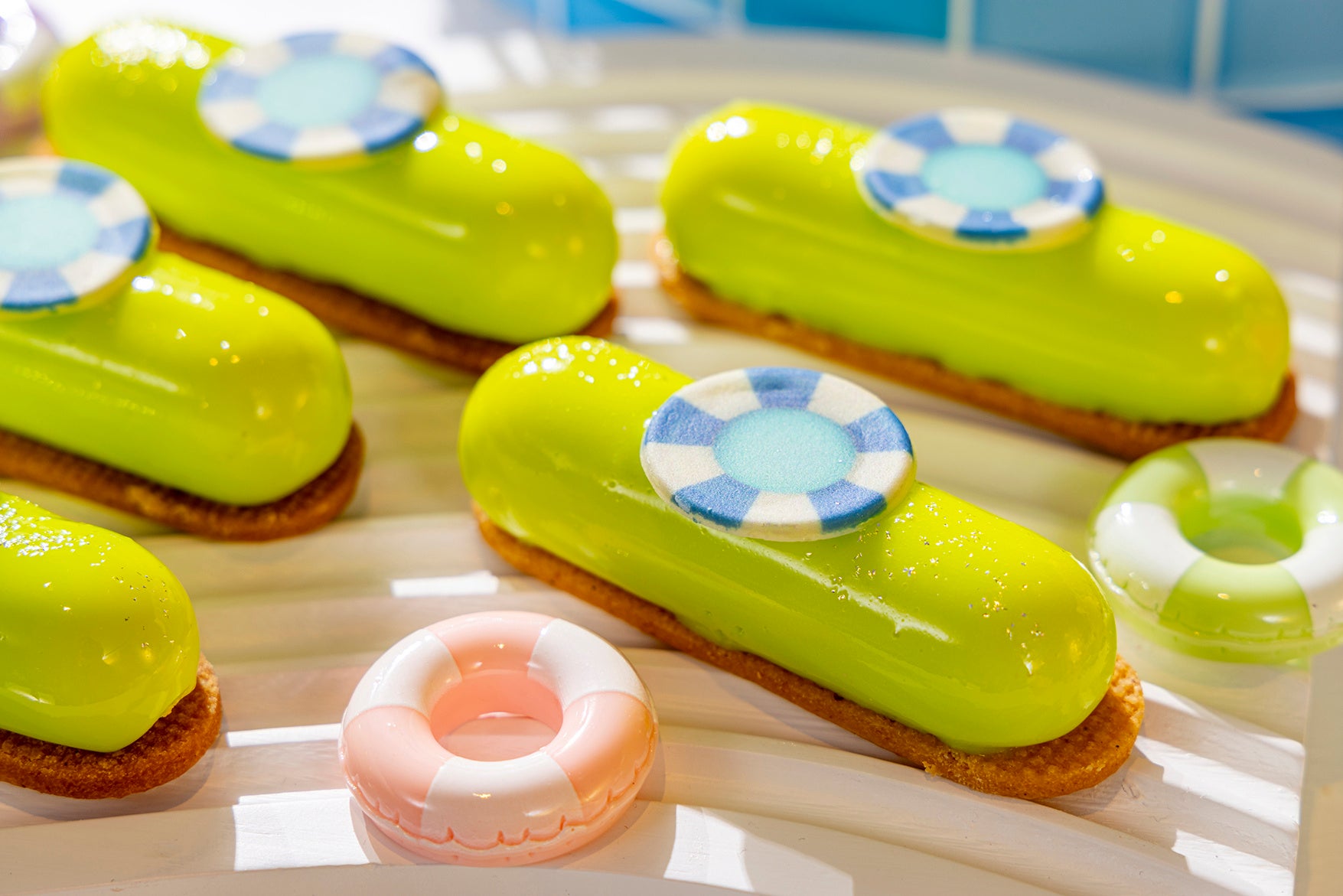 はちみつとローズマリー香るシフォンケーキをシャンティでコーティングし、キャンディレモンを冠した「レモン・スクイージー」は、フレッシュレモンとローズマリーの香りがお口いっぱいに広がる爽やかな一品です。軽やかなバニラスポンジに瑞々しいメロンを重ね、ラベンダーの香りをうつしたバニラシャンティとフレッシュメロンで仕上げた「エメラルド・ラグーン」、ピスタチオのダックワーズとレモンゼリーのレイヤーの上にリッチなバニラクレモーを重ねたドーム型ケーキ「シトラスパラソル」、カモミールが上品に香るピーチムースの中に甘酸っぱいストロベリーコンポートを配し、まるで浮き輪のようなフォルムの「ファンシーフロートリング」など、エグゼクティブペストリーシェフ ラティーシュ・ナイヤー(Ratheesh Nair)の遊び心が光る新作スイーツが揃います。