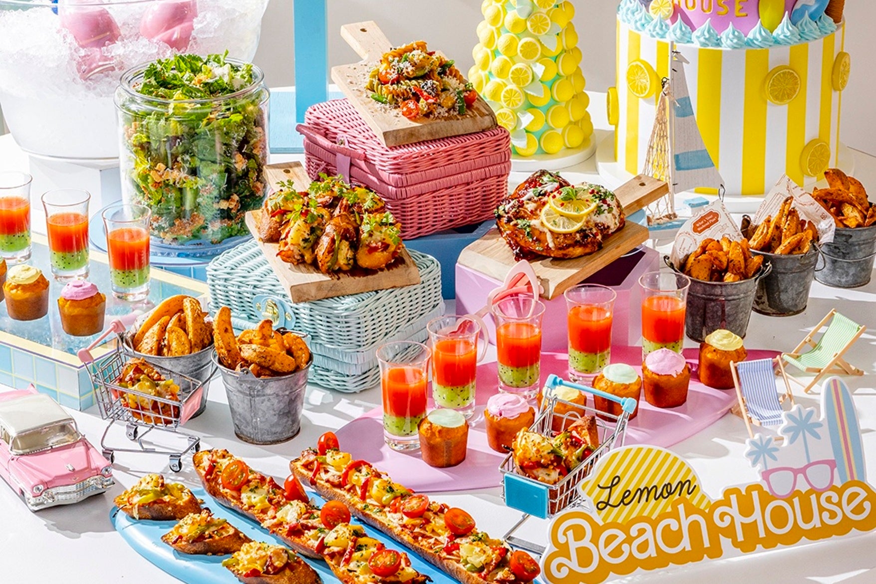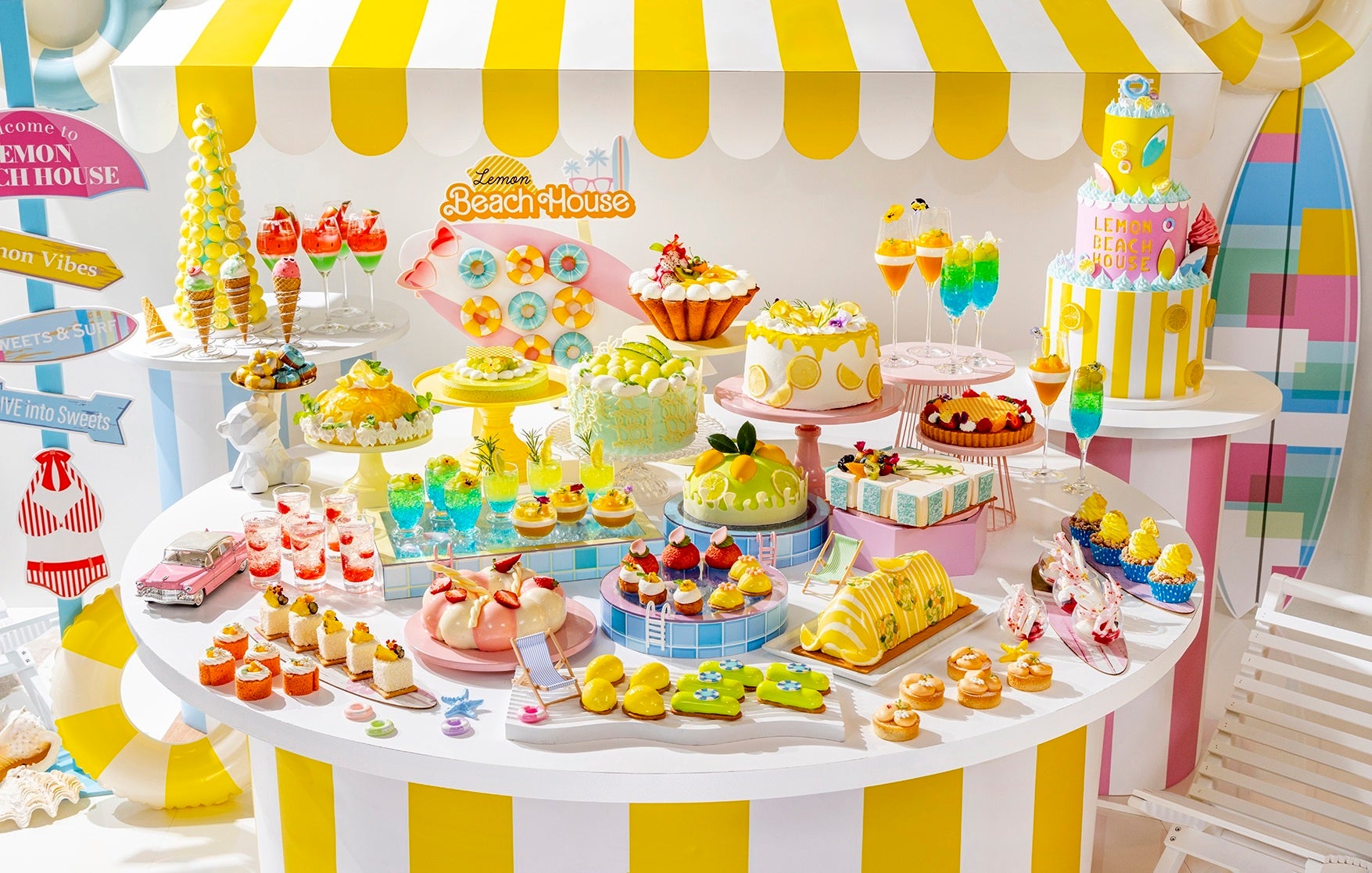 レモンやメロン、マスカットなどのフルーツを贅沢に使用したビーチハウス着想スイーツ20種類に加え、アイスクリーム、シャーベットやソフトクリームなどのひんやりスイーツも豊富にラインアップ。見た目の可愛らしさと、ひと口ごとに広がる爽やかな味わいが、夏のひと時をクールに彩ります。軽食には「スイカとトマトのスムージー」や「ギリシャ風レモンローストチキン」など全8種類をご用意。さらに“ティキバー”コーナーではカラフルな4種のノンアルコールカクテルも登場。まるでビーチハウスで寛ぐように、この夏レモンイエローに包まれながら、ひんやり爽やかなスイーツを心ゆくまで楽しむ、とびきりハッピーなひとときをお過ごしください。