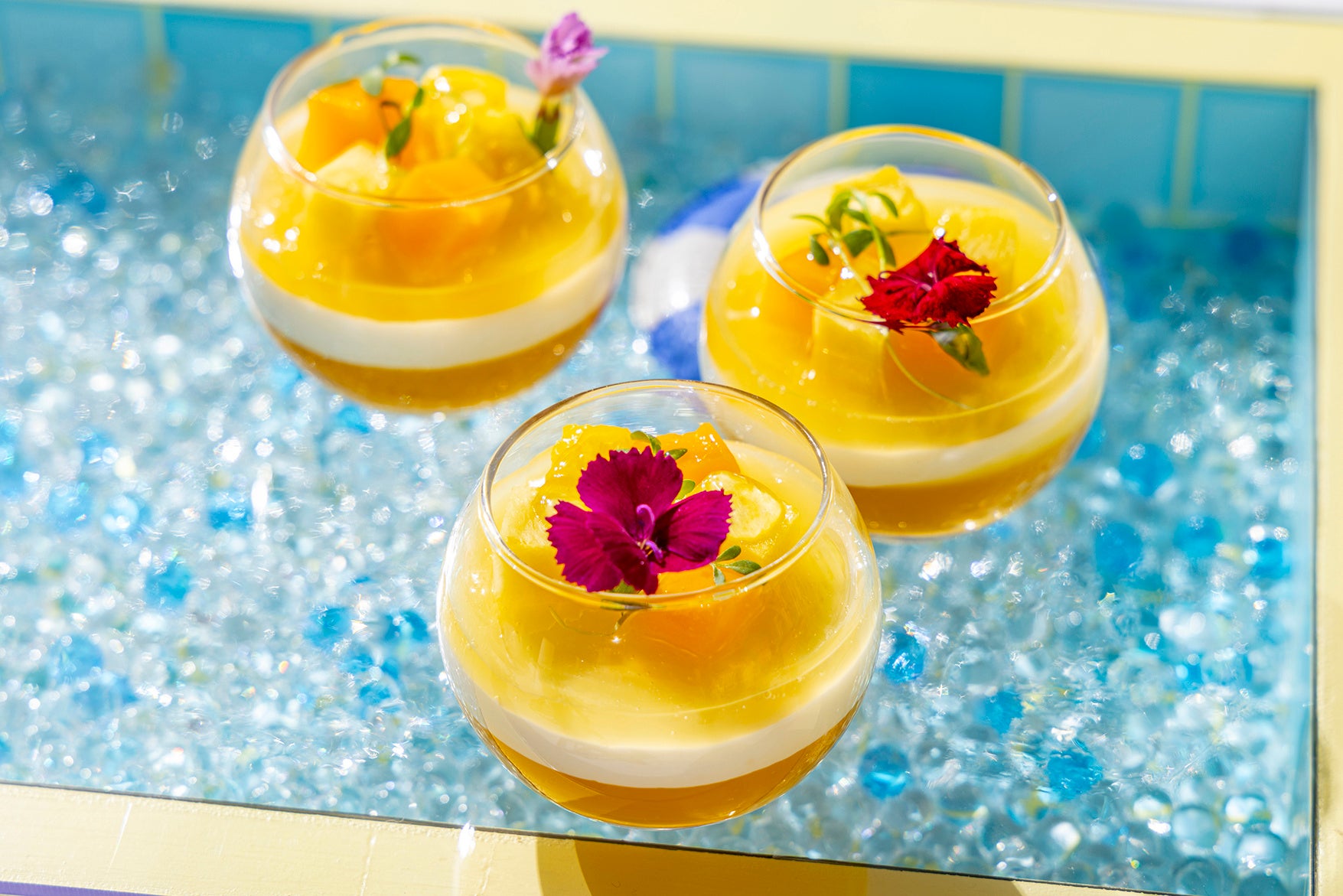 ビーチハウスで味わうカクテルをイメージしたグラススイーツも各種登場します。シーソルトをきかせたスイカゼリーとキウイゼリー、さらに杏仁豆腐をレイヤーにし、まるでスイカのような色合いの「ウォーターメロンブリーズ」、幻想的なブルーのバタフライピーゼリーに瑞々しいマスカットゼリーを重ね、フレッシュマスカットをトッピングした「ブルー・マスカット」、マンゴームース、バニラパンナコッタにジューシーなマンゴーコンポートが南国気分を誘う「マンゴーサンセット」など、涼し気なグラススイーツを片手にカクテル気分もお楽しみいただけます。