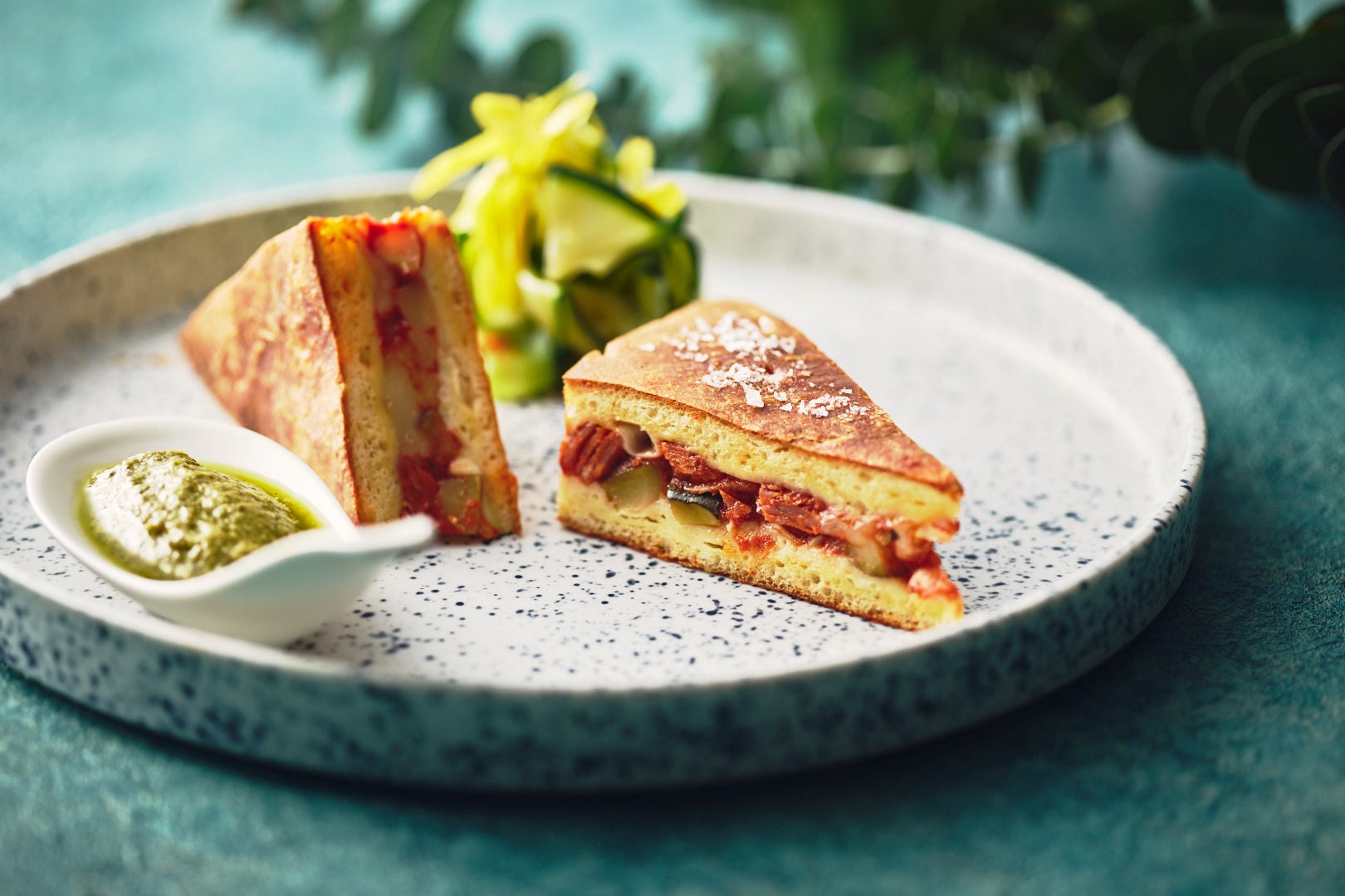 また、シェフ特製のオリジナルピザは、ジェノヴァの伝統的なセイボリーパイを、イタリアのストリートフードに着想を得て表現。ズッキーニやセミドライトマト、バジルペースト、玉ねぎとニンニクをじっくり炒めたミートソースを合わせ、仕上げに軽やかなチーズクリームとフレッシュなズッキーニを添えました。コクがありながらも軽やかな味わいで、他の食材との絶妙なバランスが際立つ一品です。
