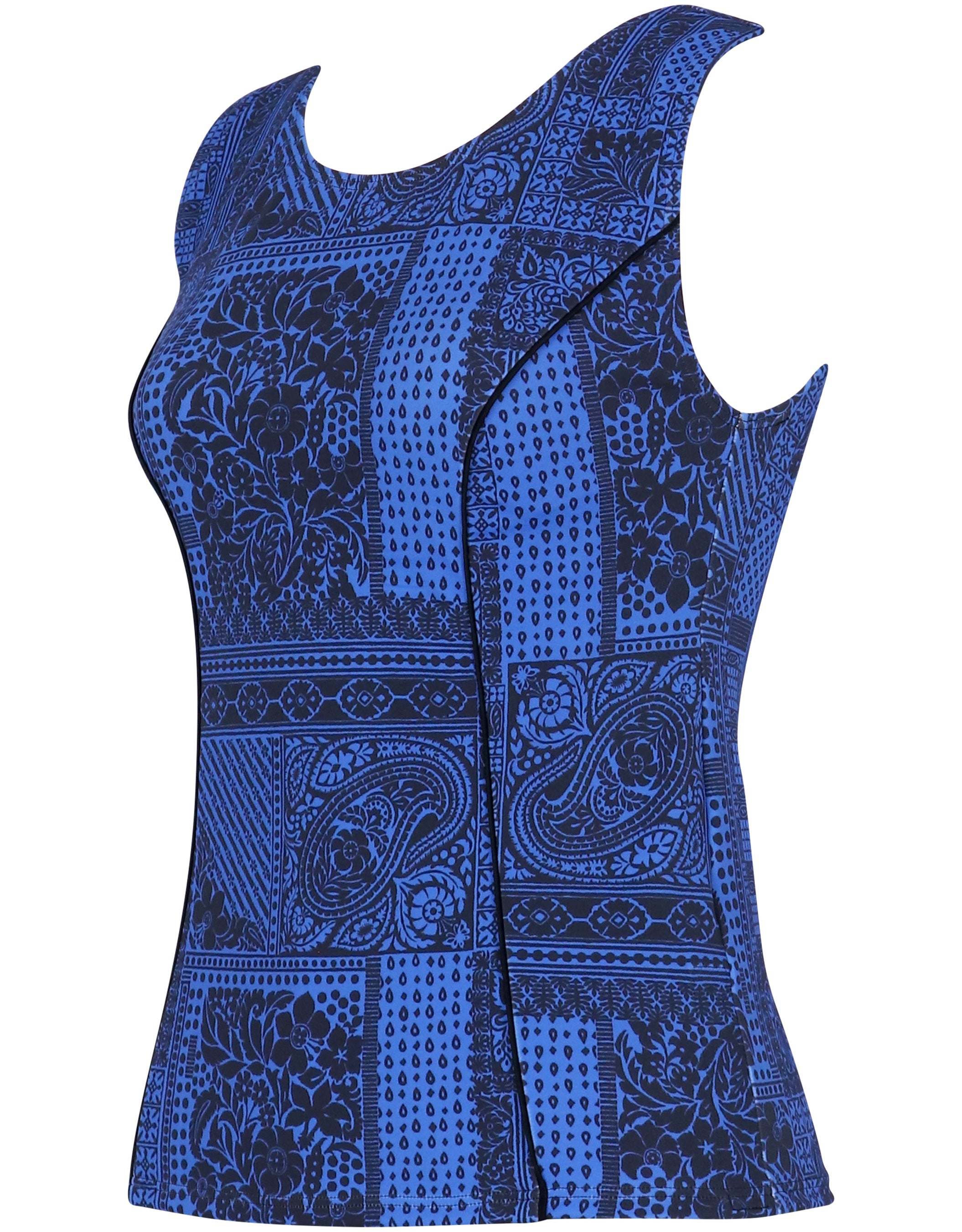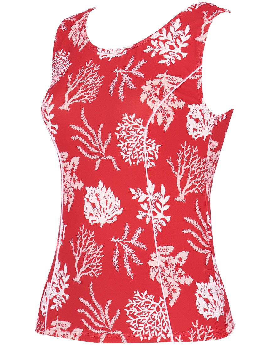 やや太めの肩ひもやストレートな袖ぐりのカッティングにより、気になるはみ肉が目立ちにくく、アウターライクに着用できるデザインに。繊細なサンゴモチーフを組み合わせた夏らしい柄を採用し、機能性と華やかさを兼ね備えた一枚です。