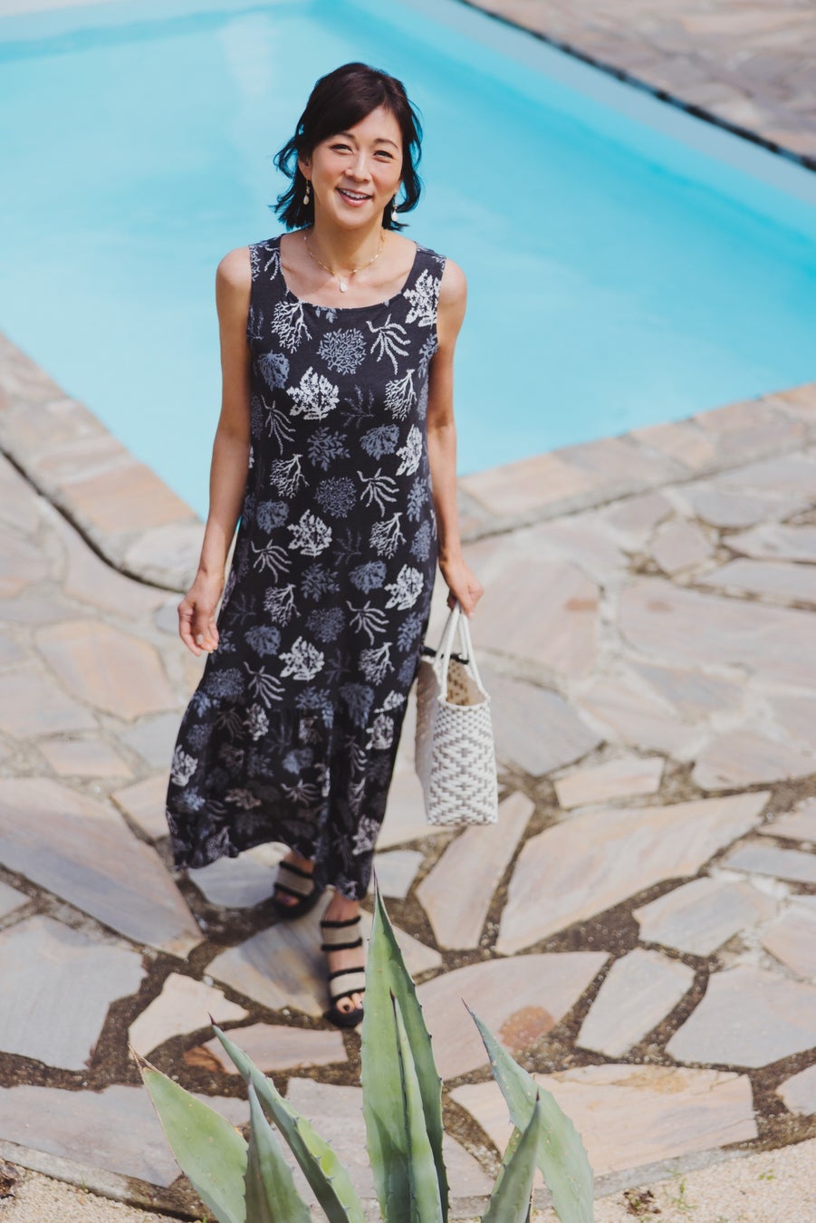 リゾートでは、着ごこちがよくてシルエットをきれいに見せてくれるアイテムを選ぶようにしています。今回のアイテムの中では、[ノースリーブロングワンピース]と [楊柳前あきワンピース]は欠かせないですね。どちらも一度着ると色違いが欲しくなるほど快適ですし、流行に左右されないデザインなので長く愛用できます。