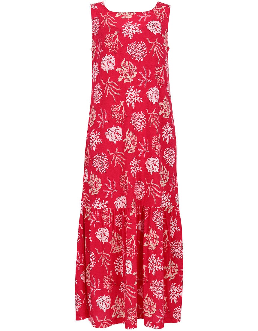 ●[ノースリーブロングワンピース]と[楊柳前あきワンピース]、[カップ付きタンクトップ]をラインアップ。繊細なサンゴモチーフを組み合わせた夏らしい柄を採用し、華やかさと上品さを兼ね備えたデザインに。
