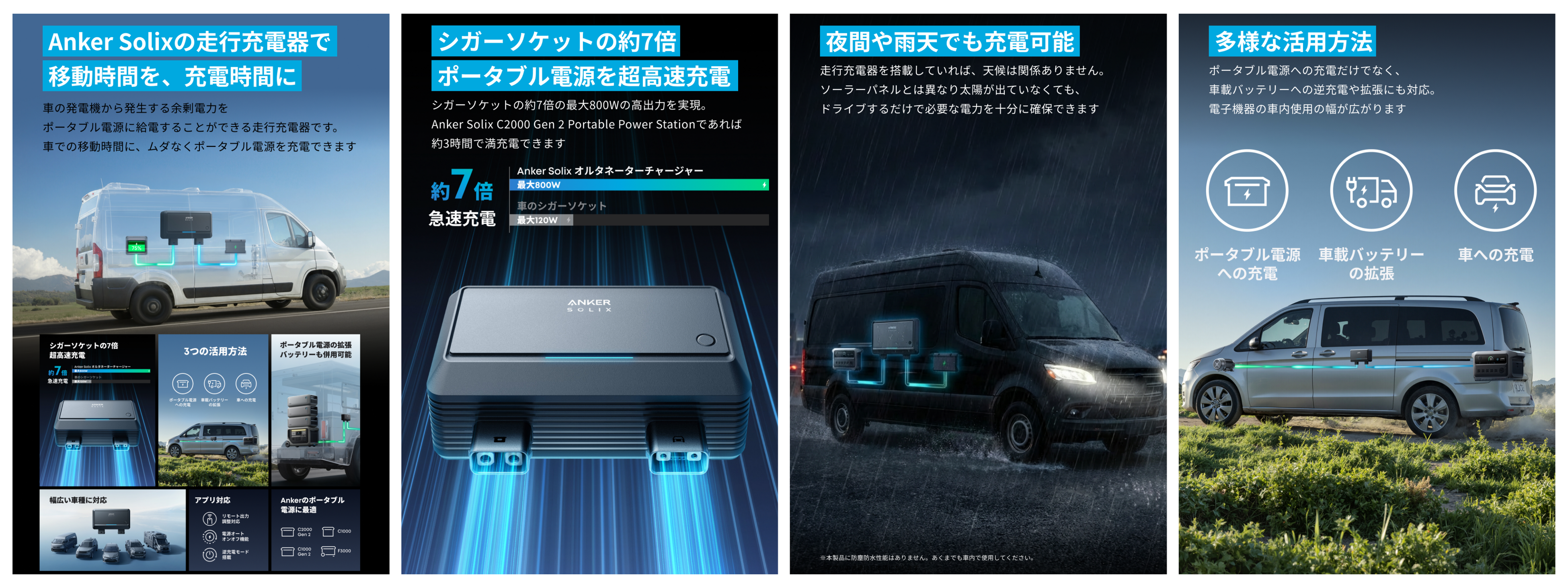 本製品は、車の走行中にバッテリーから発生する余剰電力を使用することで、時間と電力の両軸で効率的にポータブル電源へ給電・充電することができるAnker初の走行充電器です。最大800Wの高出力を誇り「Anker Solix C2000 Gen 2 Portable Power Station」に対しては、一般的な車のシガーソケットと比較して約7倍の速さとなるわずか約3時間での充電が可能です(※1)。数日にわたる車中泊やキャンプ等での使用により充電が不足してしまった場合でも、夜間や雨天など天候に左右されることなく車中で充電が可能なため(※2)、電力不足の不安を大きく軽減します。SUVやワンボックス、キャンピングカー等の幅広い車種に対応しています(※3)。
