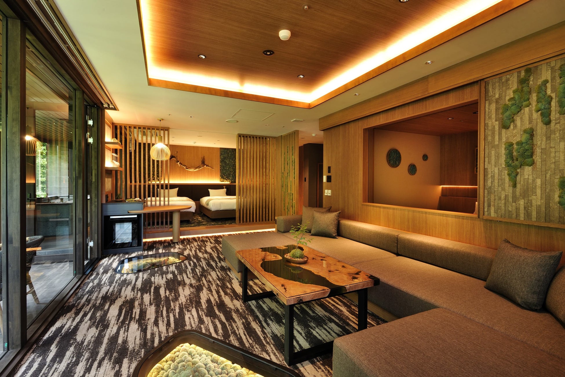 苔をテーマにした1室限定の客室「苔スイートルーム」です。客室の至るところに渓流の苔を感じられ るデザインを施し、苔に包まれているかのような贅沢感とくつろぎを感じられます。中でも目を引くの は、リビングルームの壁やと床下に設えた本物の苔を使用したインテリアで、どこを見ても苔尽くしの 空間が広がります。