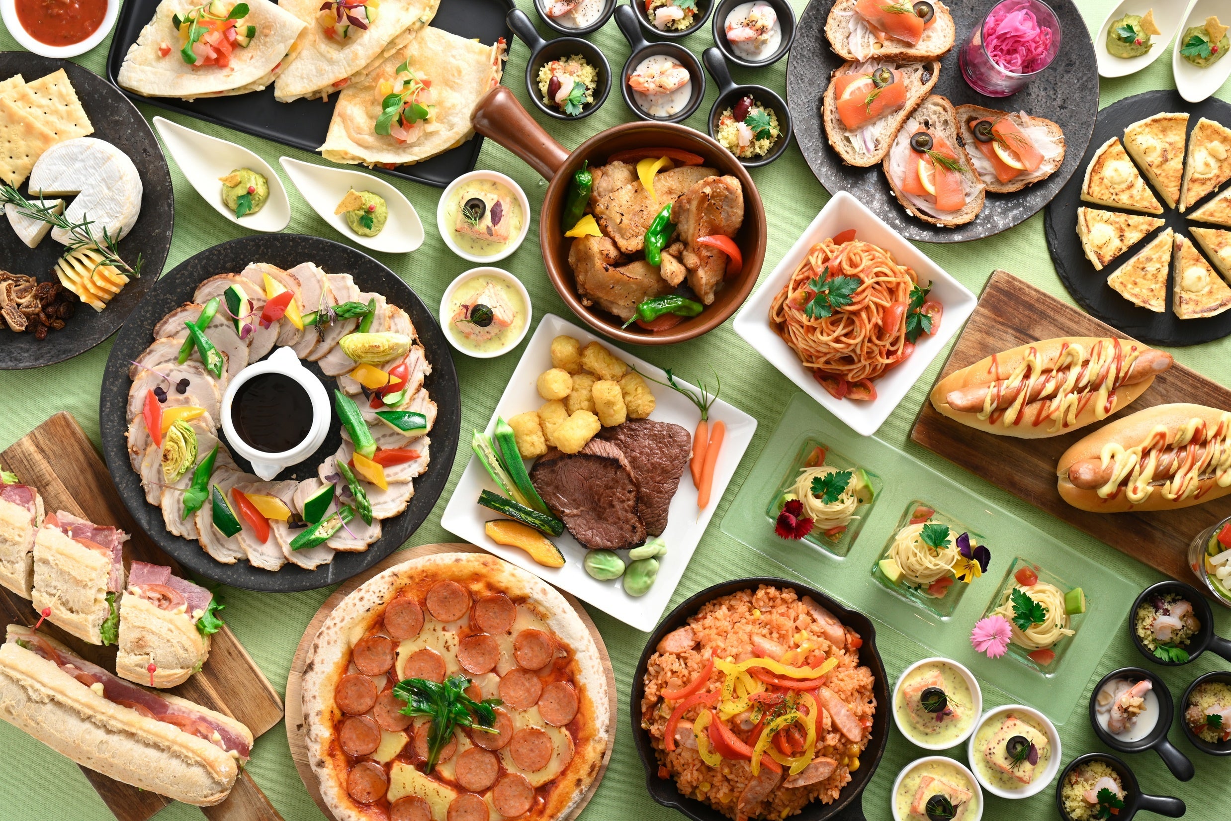ライブキッチンでは、出来立ての「牛肉の鉄板焼き」とアメリカのソウルフード「ホットドック」を、ビュッフェでは、トルティーヤにチーズを挟んで焼いたメキシコ料理「ケサディーア」やアメリカ発祥の肉や魚介をスパイスとともに炊き込む米料理「ジャンバラヤ」などが登場。土日祝ディナー限定で「にぎり寿司」や「サーモンのパイ包み焼き」もご提供し、曜日や時間帯によって異なるメニューが味わえるのも本ビュッフェの魅力です。