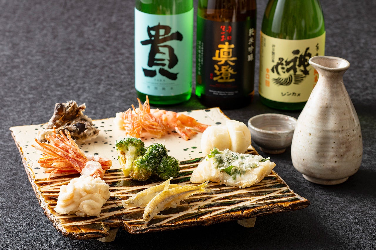 お食事と共にお愉しみいただけるよう、ホテルのソムリエと利き酒師による天ぷらに合わせた厳選メニューをご用意しました。中でも日本酒には特に拘っており、地元である埼玉県の有名な蔵元「神亀酒造」のお酒をはじめ、日本全国の銘酒をご用意しております。