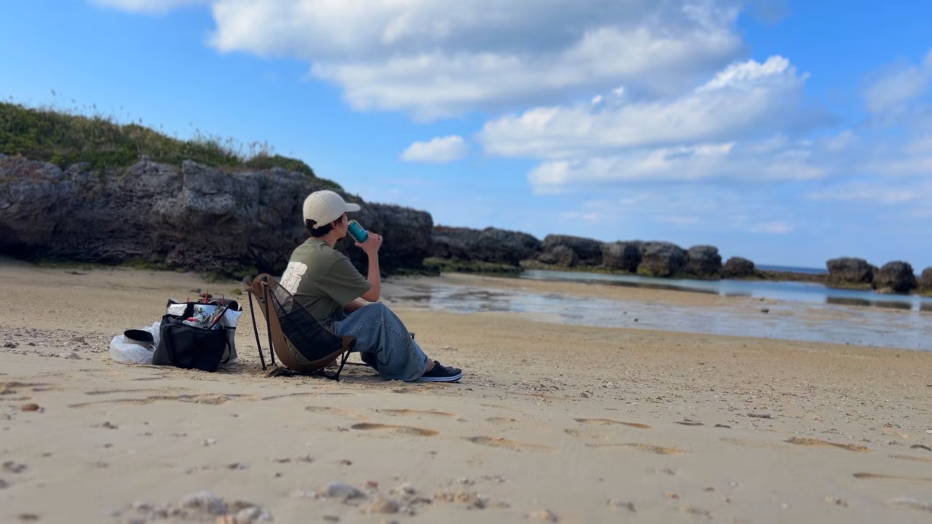 キャンプ場に到着しテントを設営した後は、キャンプ場の隣にあるビーチへ直行。チェアに腰かけて、目の前に広がる「トカラブルー」の海を見ながら、まず乾杯。