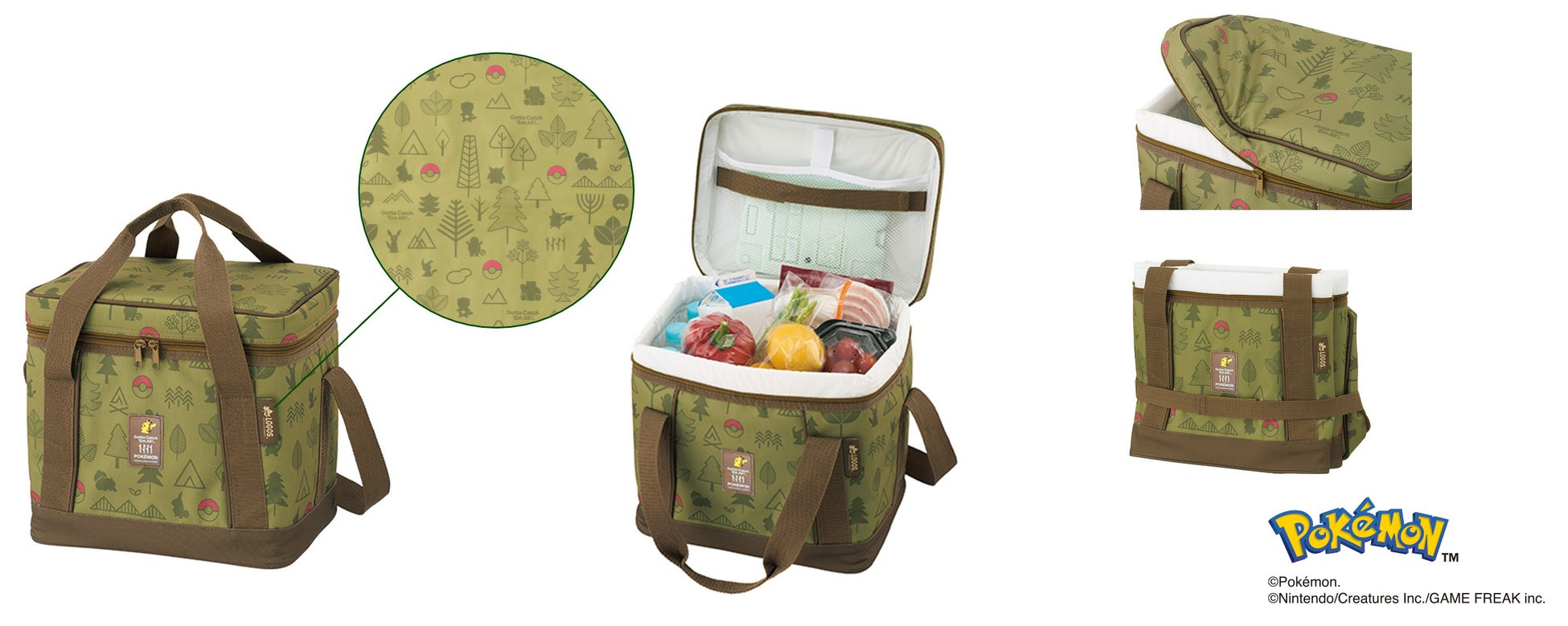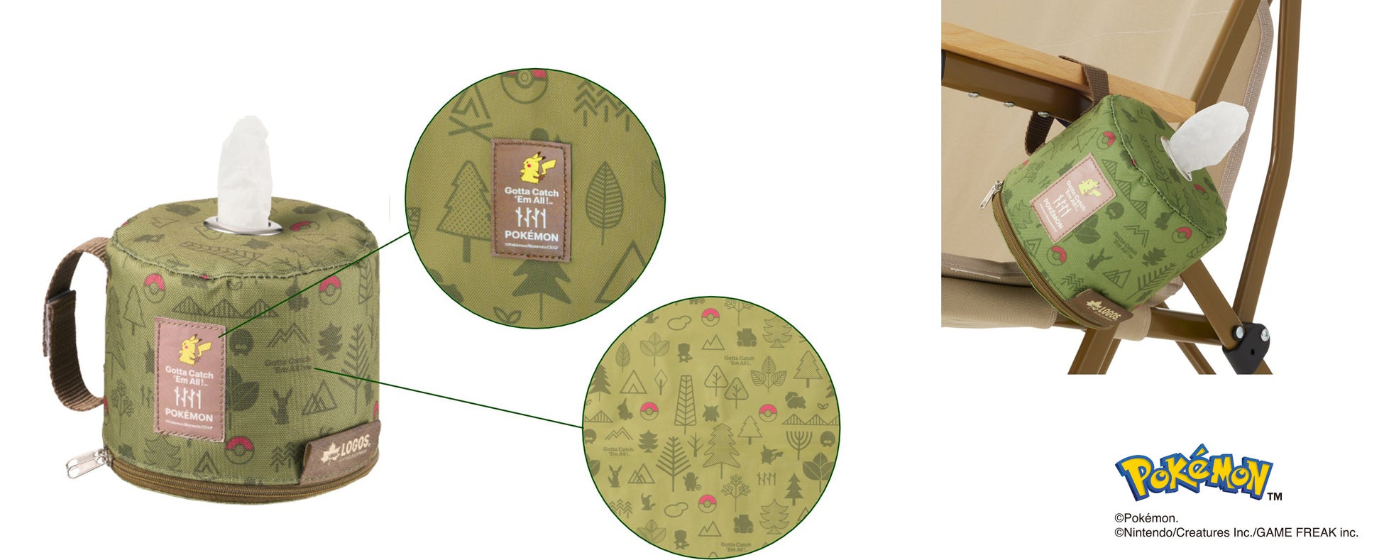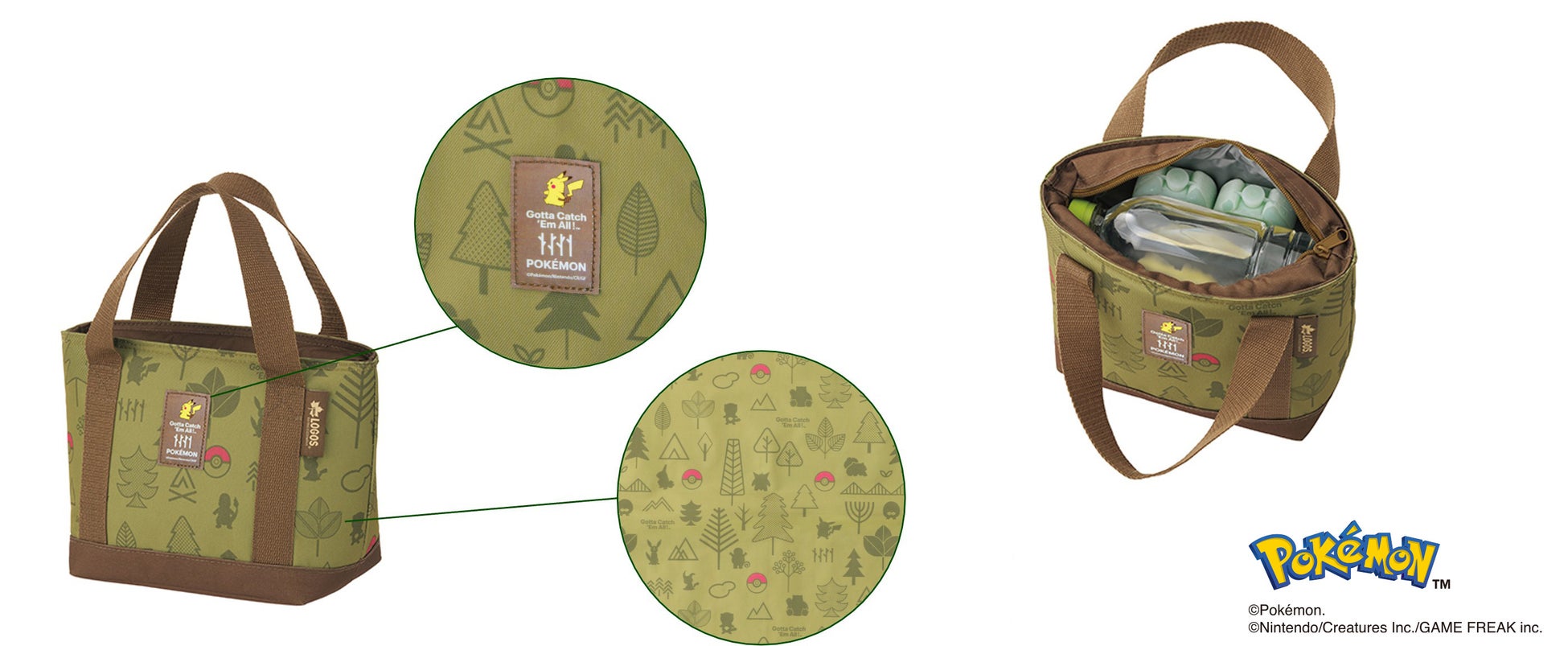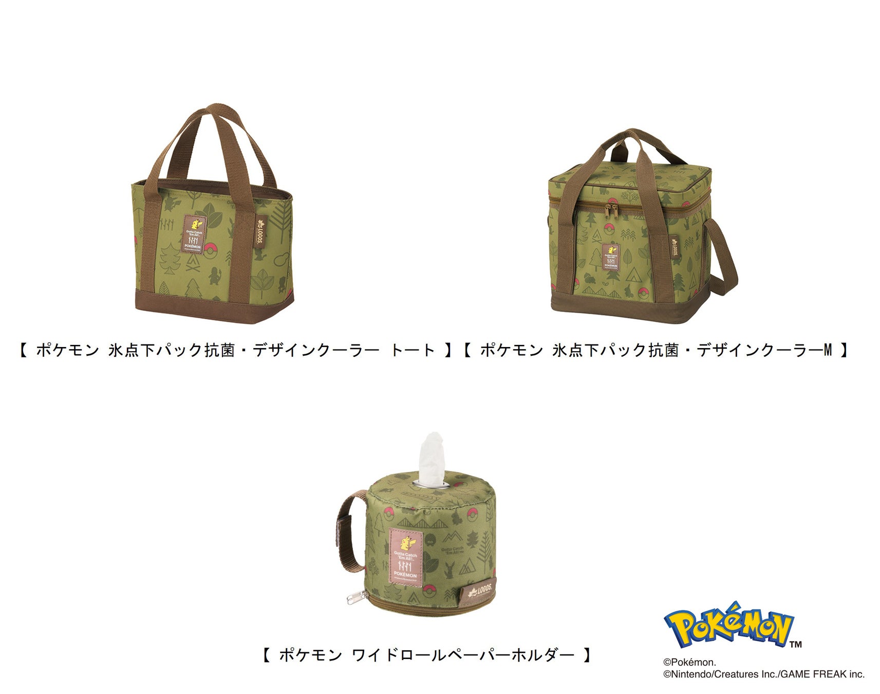 今回ご紹介するアイテムは、クーラーバック2種と、ロールペーパーホルダーの全3アイテムです。自然モチーフの中にポケモンたちのシルエットを散りばめた遊び心あるデザインで、ピカチュウをあしらったネームタグがワンポイントです。