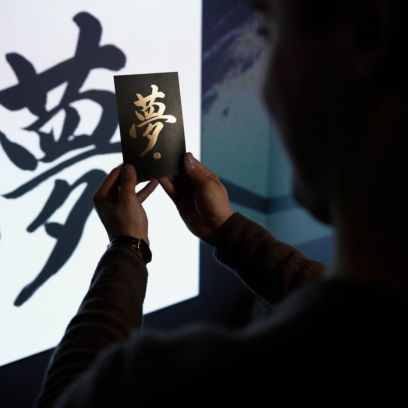 映像、音楽、香りなど、和を感じさせる演出に囲まれたイマーシブ空間で、プロジェクションによって映し出されるお手本を参考に、キャンバスへダイナミックに漢字を書き上げる書道パフォーマンスが体験できる。ゲストが書き上げた作品は、グッズ化に適したデジタル処理が施され、箔印刷、掛け軸、刺しゅうなど、多彩なオリジナルグッズにすることが可能【※1・2】。