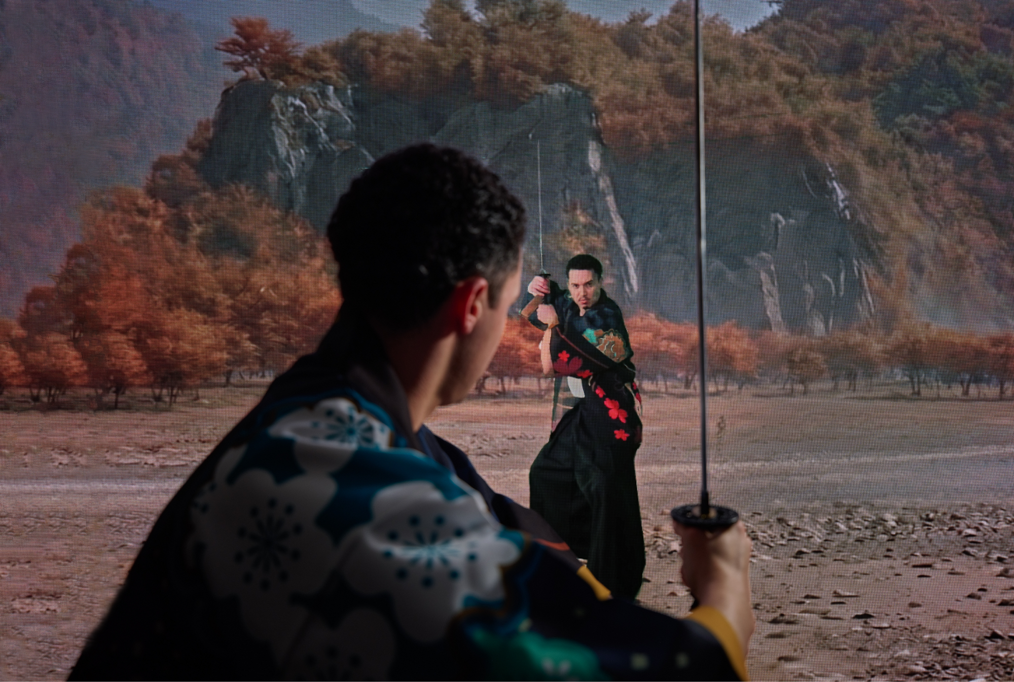 侍装束に着替え、超大型ビジョンに映る師範に合わせて刀を振ることで、映像演出と連動した「侍アクション体験」を楽しめる。ゲストの演武姿はAI処理によってさらに美しく、力強いビジュアルに変換され、その場でプリントされたオリジナルTシャツとして持ち帰ることができる。さらに缶バッジやマグカップなどのグッズを作成することも可能【※1】。また、体験のハイライトはショート動画に生成され体験後すぐにゲストに送信されるので、旅先での「主役体験」をそのまま世界中の友人やフォロワーにSNSなどを通じてシェアすることもできる。
