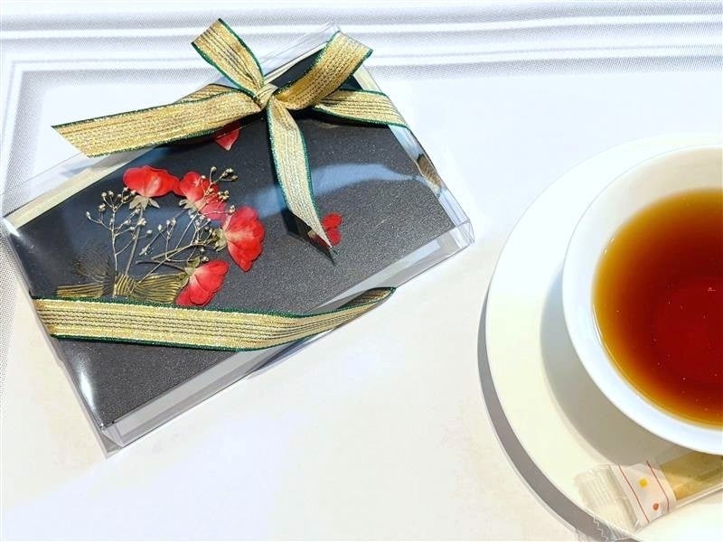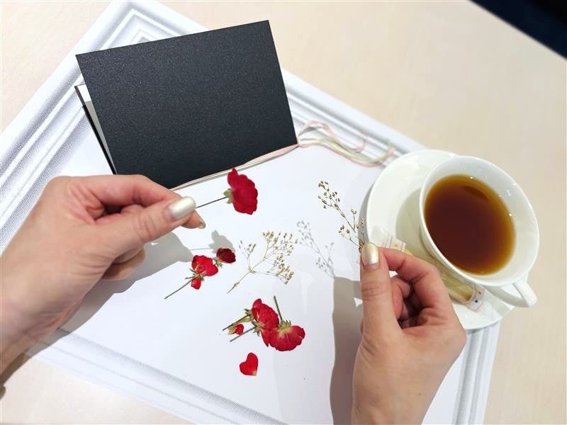 二つ折りのメッセージカードに赤いバラの押し花を自由にあしらい、リボンや装飾素材で仕上げていきます。完成したカードには、日頃の感謝や想いを言葉にして書き添え、そのまま大切な人へ贈ることができます。