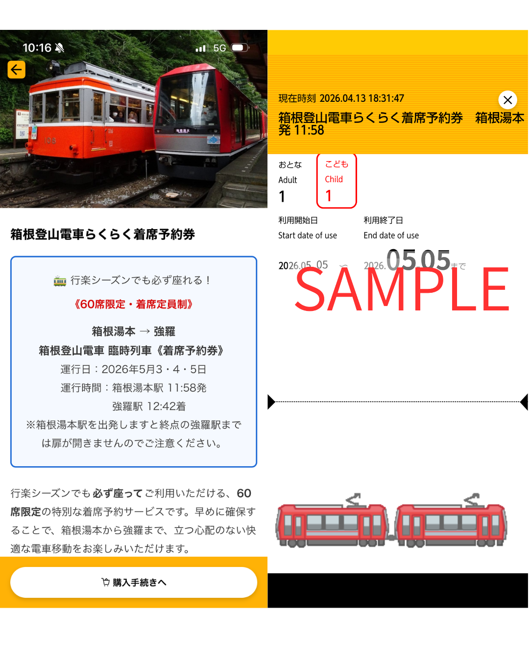 株式会社小田急箱根(本社:神奈川県小田原市、社長:水上 秀博)は、2026年5月3日(日)から5日(火・祝)の3日間、ゴールデンウィークの箱根登山電車の旅を快適にお楽しみいただけるよう、箱根湯本駅11時58分発、強羅駅行きの臨時列車を運行し、新たに座席予約券「らくらく着席予約券」を発売します。