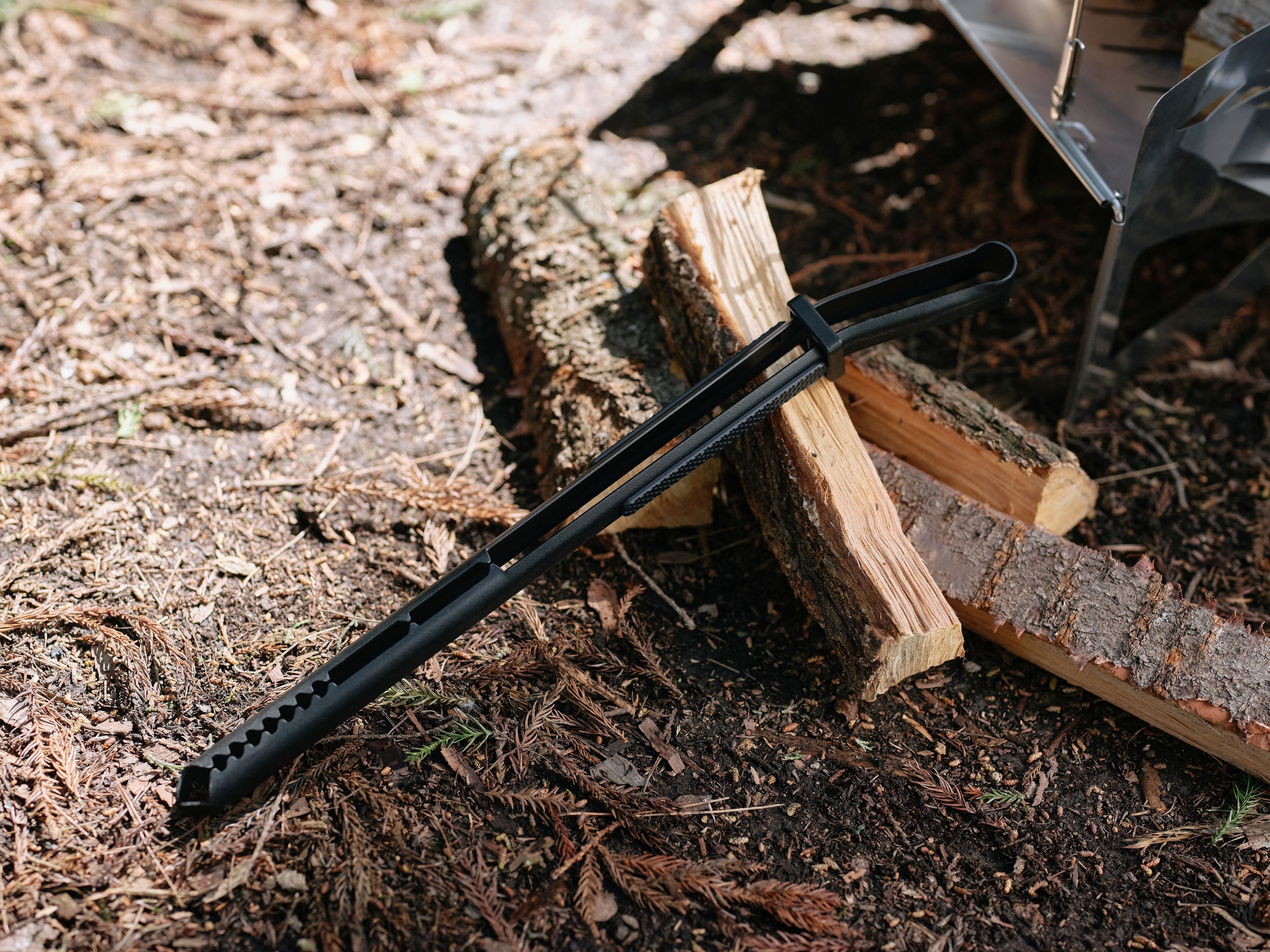 焚き火における薪の操作性と安全性を高めるために設計された火バサミ。