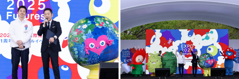 最後には越智俊之経済産業大臣政務官と吉村洋文大阪府知事が駆け付け、歴代博覧会のキャラクターである花の万博の花ずきん、愛・地球博のモリゾー&キッコロ、GREEN×EXPO2027のトゥンクトゥンク、ミャクミャクとともに登場しました。○『One World, One Planet.』開幕1周年メモリアルプログラム