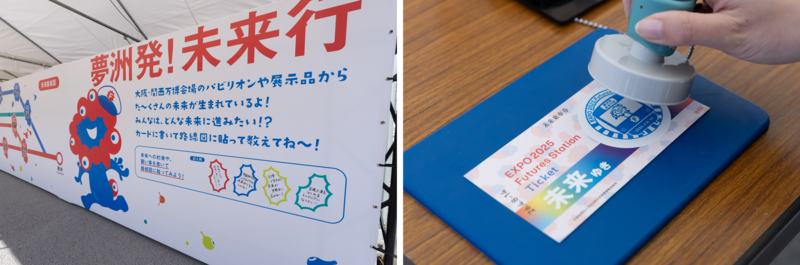 未来へ出発するミャクミャクをモチーフにした駅看板から始まり、大阪・関西万博を振り返る写真や万博で生まれた技術や取り組み、未来社会に向けたプロジェクトを紹介したほか、参加者が進みたい未来を書いてボードに貼り付ける企画展示などを実施。
