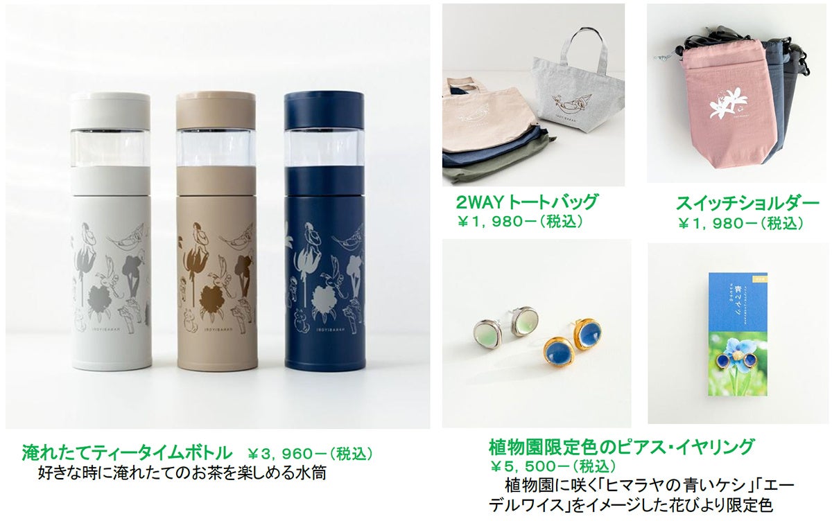 ショップでは、イベントのメインイメージをあしらったトートバッグや水筒、植物園限定色のピアスなど、行楽にぴったりなグッズを販売します。