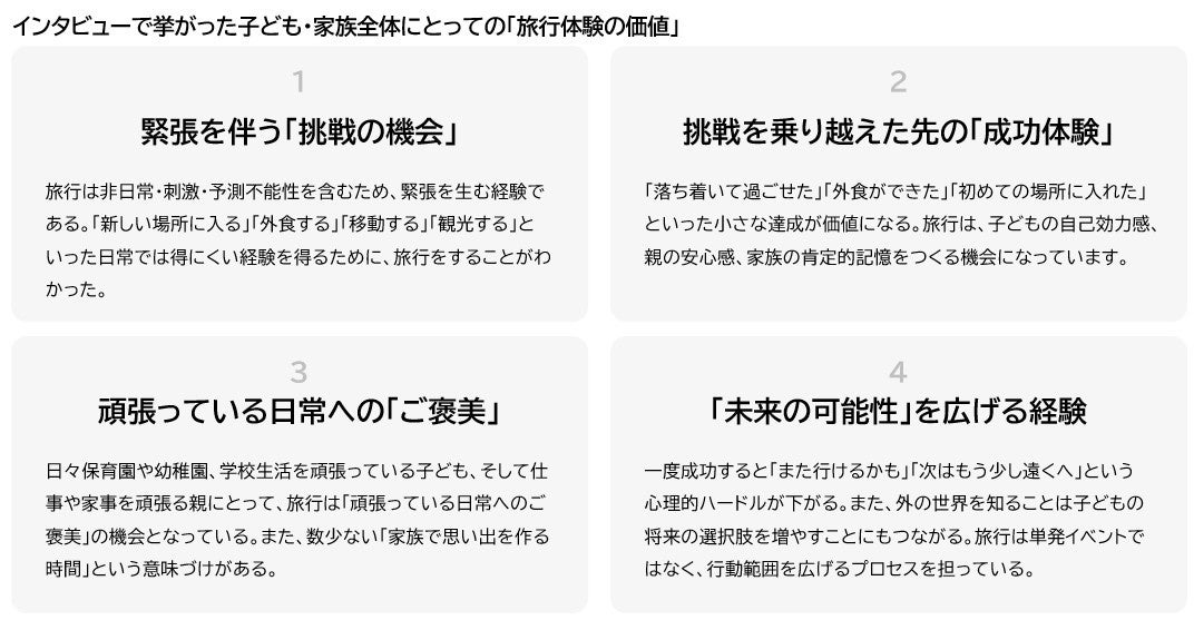 ・旅行は単なるレジャーではなく、「家族での挑戦」や「成功体験」として重要な価値を持つことが明らかに