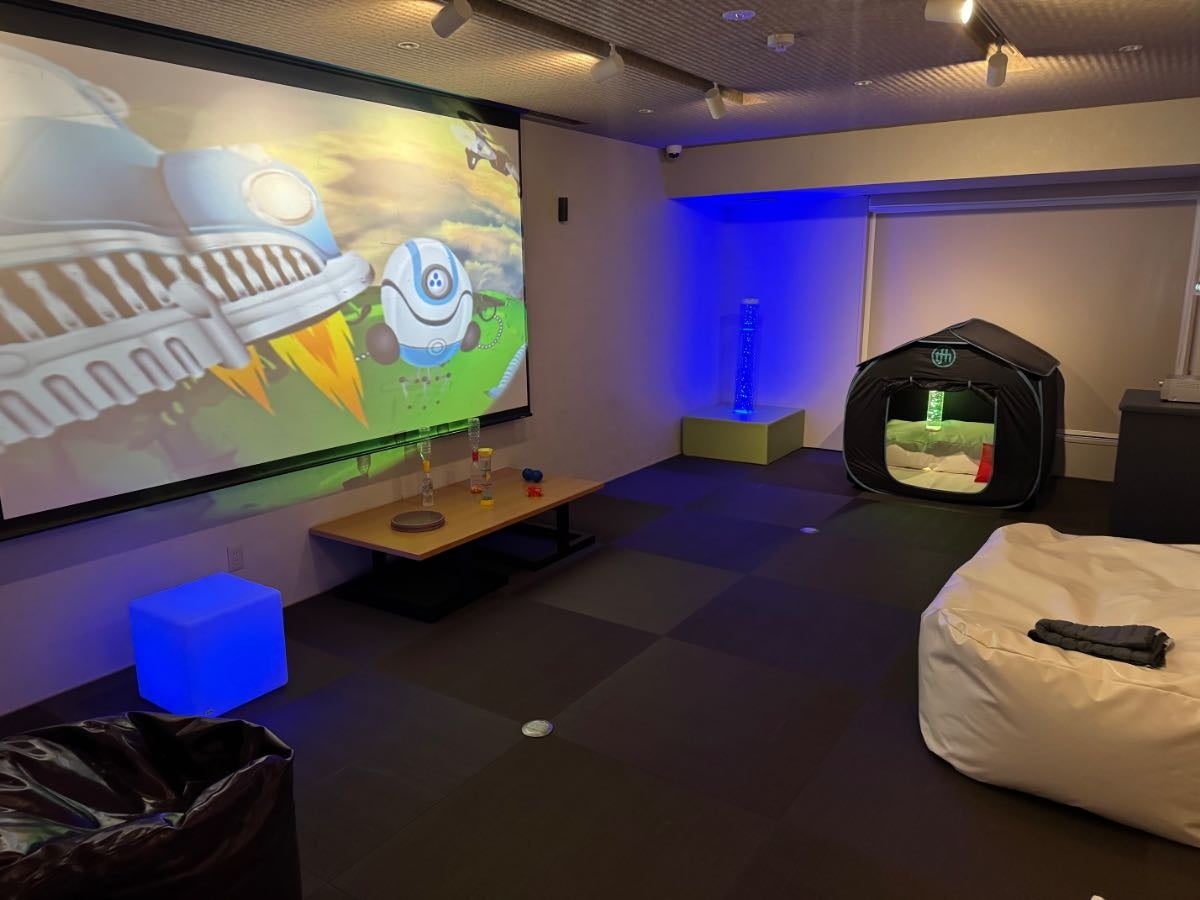 客室内には、外部からの刺激を遮断して静かに休める「ほっとコーナー(カームダウンエリア)」を設置しました。さらに、共用部には有限会社コス・インターナショナルの協力のもと、オランダ発祥の「スヌーズレン」という環境設定の考え方を取り入れ、スヌーズレン用品で五感を優しく刺激する「ひかりとふわふわのばしょ(スヌーズレンコーナー)」を設けました。