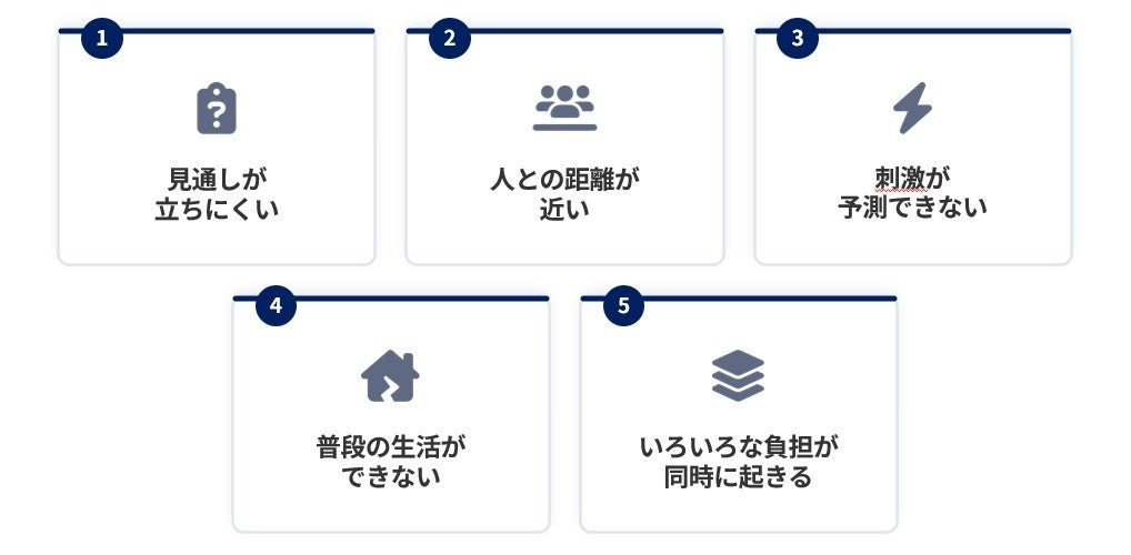 見知らぬ土地での旅行は、予測できない出来事の連続です。だからこそ、宿泊施設は単なる「寝る場所」だけではなく、外で感じた疲労や緊張を解きほぐし、安心して元の自分に戻れる“拠点”として機能することが重要であると考えられます。今回の事前調査を通じて、特性のある子どもとご家族が旅行中に直面する主な課題は、以下の5つに整理できました。