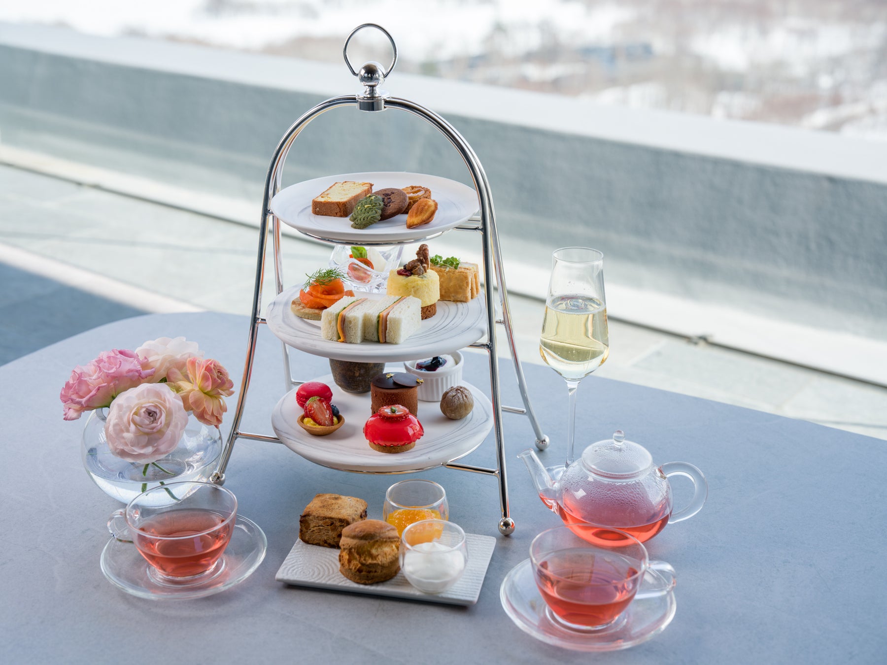 静寂に包まれた午後のひとときを優雅に彩る、グリーンシーズン限定のアフタヌーンティー。8階にあるスカイラウンジ「雲海」から望む雄大な自然とともに、北海道の素材と季節感を織り込んだ繊細なスイーツとセイボリーをお楽しみいただけます。三段のティースタンドには、バターの香り豊かなガレットブルトンヌやマドレーヌなどの焼き菓子に加え、抹茶プリンや栗の茶巾絞り、マスカルポーネムースやフロマージュブランのムースなど、和洋を織り交ぜた軽やかな味わいをラインナップ。さらに、旬のフルーツを使ったタルトレットやハスカップの爽やかな酸味を効かせたデザートが、季節の彩りを添えます。下段には、生ハムとチーズのサンドイッチや蟹のミルフィーユ、スモークサーモンのパンケーキなどのセイボリーを揃え、甘味と塩味の絶妙なバランスを実現。ニセコの自然とともに、五感で味わう贅沢なティータイムをお届けします。