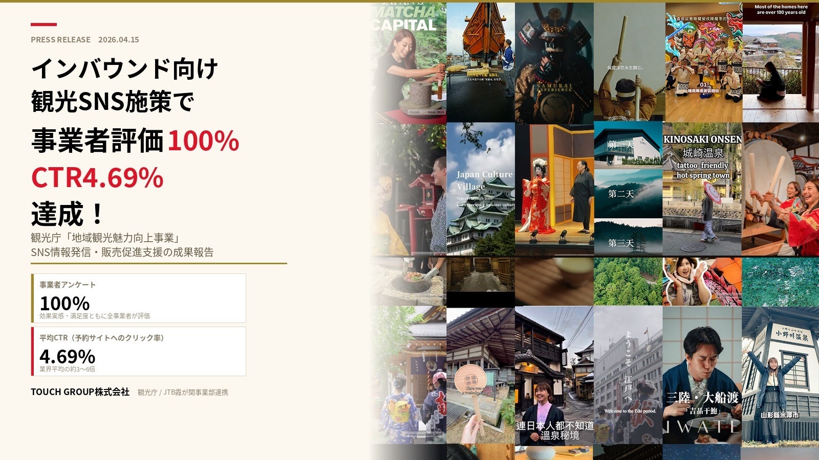 TOUCH GROUP株式会社(本社:東京都港区、代表取締役:原田静織)は、観光庁が推進する2024年度補正「地域観光魅力向上事業」において、株式会社JTB霞が関事業部と連携し、全国の観光事業者を対象に、Instagramを活用して欧米豪・アジア主要市場を含む約30カ国以上に向けた情報発信および販売促進支援を実施いたしました。