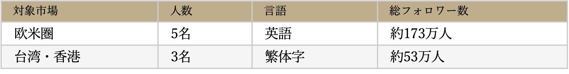 総フォロワー数225.7万人を擁する8名のインフルエンサーを起用しました。欧米圏向けに英語で発信する5名、台湾・香港向けに繁体字で発信する3名という構成で、ターゲット市場に合わせた多言語での情報発信を実現しています。うち2名は海外在住のインフルエンサーを招致し、よりリアルな外国人目線でのコンテンツ制作を可能にしました。
