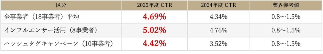 事業全体の平均CTR(クリック率)は4.69%となり、昨年度実績(4.34%)を上回りました。旅行業界のInstagram広告における一般的なCTRが0.8〜1.5%とされる中、本事業は業界平均の約3〜6倍の水準を達成しています。
