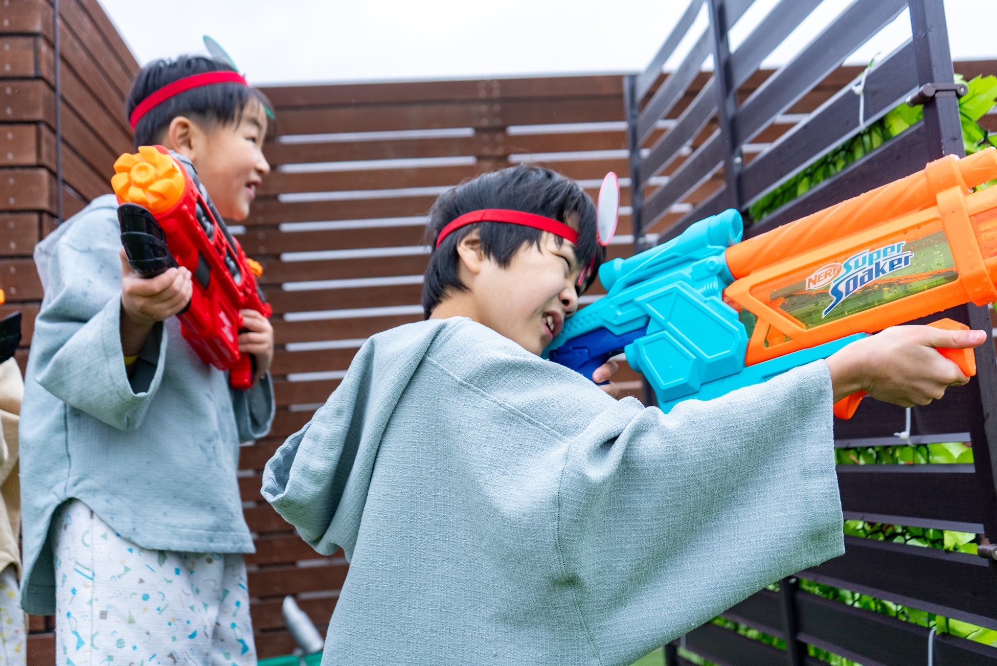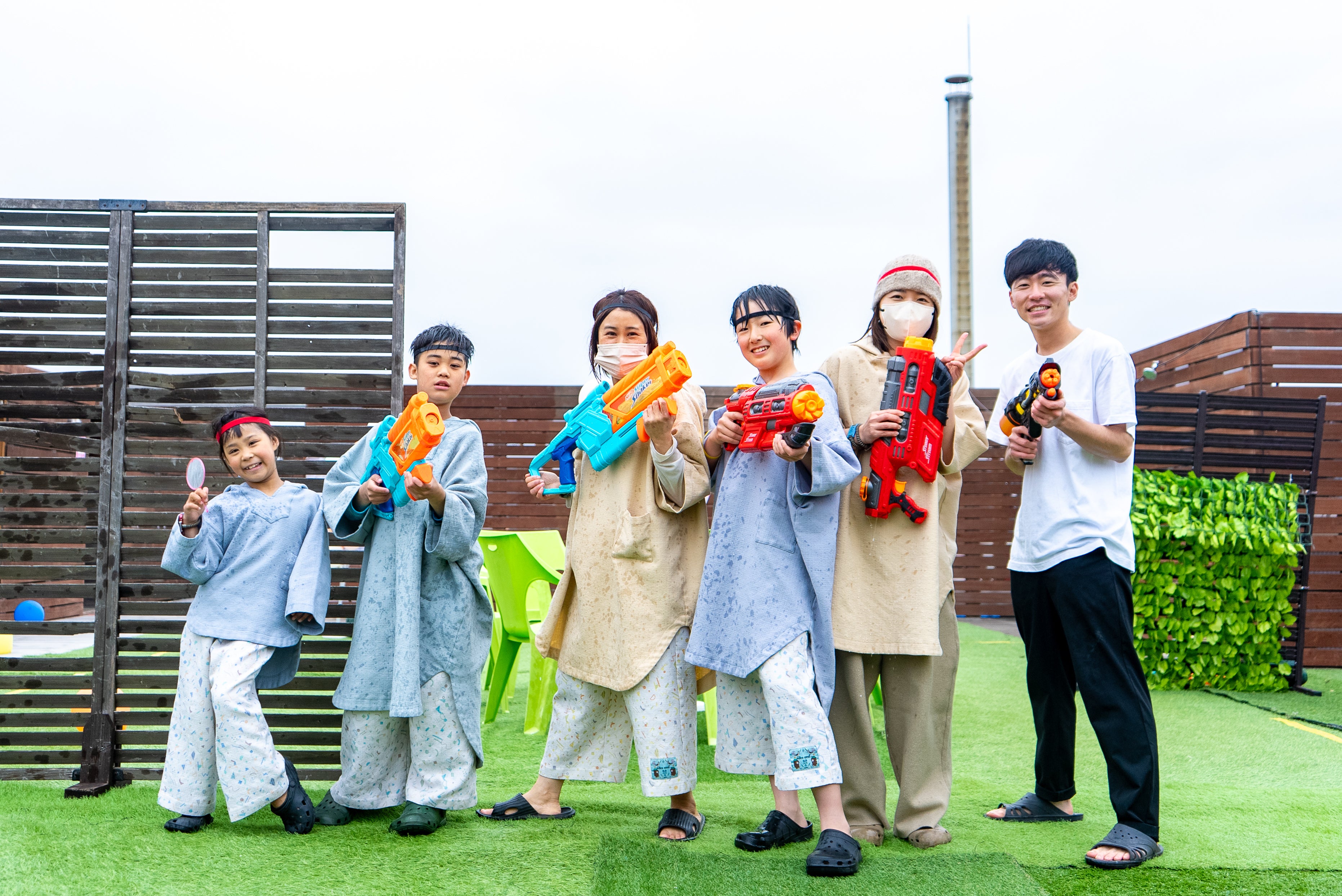 水鉄砲を使ったサバイバルゲームを、屋上フィールドで開催します。頭に付けた金魚すくいの「ポイ」を水鉄砲で狙い合う白熱のバトルです。フラッグ戦・殲滅戦・大将戦・バトルロワイヤル戦の4ルールから3つを選んで開催。3歳から大人まで全力で楽しめます。びしょ濡れになったあとは、そのままおふろへ直行してさっぱりどうぞ。