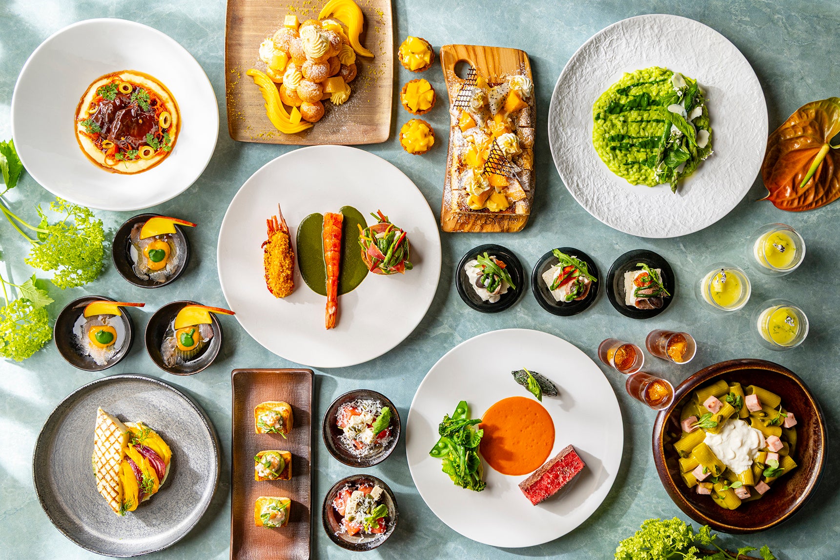 アンティパスティ(前菜)とドルチェ(デザート)はビュッフェスタイルでご用意し、メインディッシュはお好みに合わせてお選びいただけるスタイル。トロピカルフルーツやハーブ、彩り豊かな野菜を取り入れ、軽やかさと満足感を兼ね備えたラインナップに仕上げました。