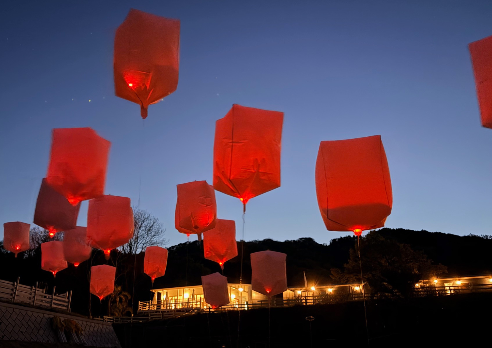 夜にはランタンを飾り幻想的な雰囲気の中お散歩を楽しんでもらいました。※スカイランタンはナイトドッグラン開催時期に不定期で開催予定。