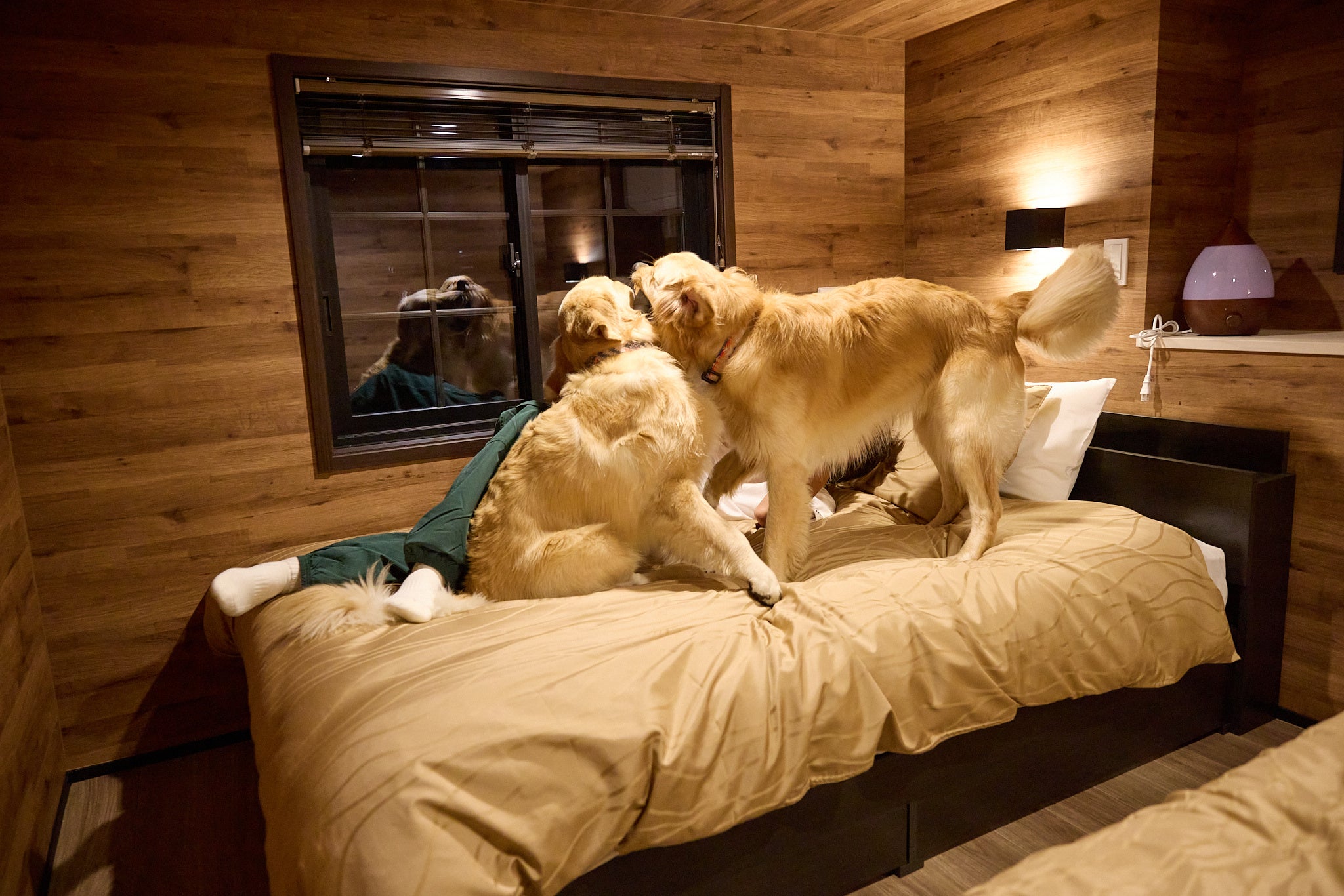 施設には宿泊も可能。愛犬との添い寝が可能なベッドルームやサウナ、プロジェクター、など、ご家族で楽しめる設備がたくさん。