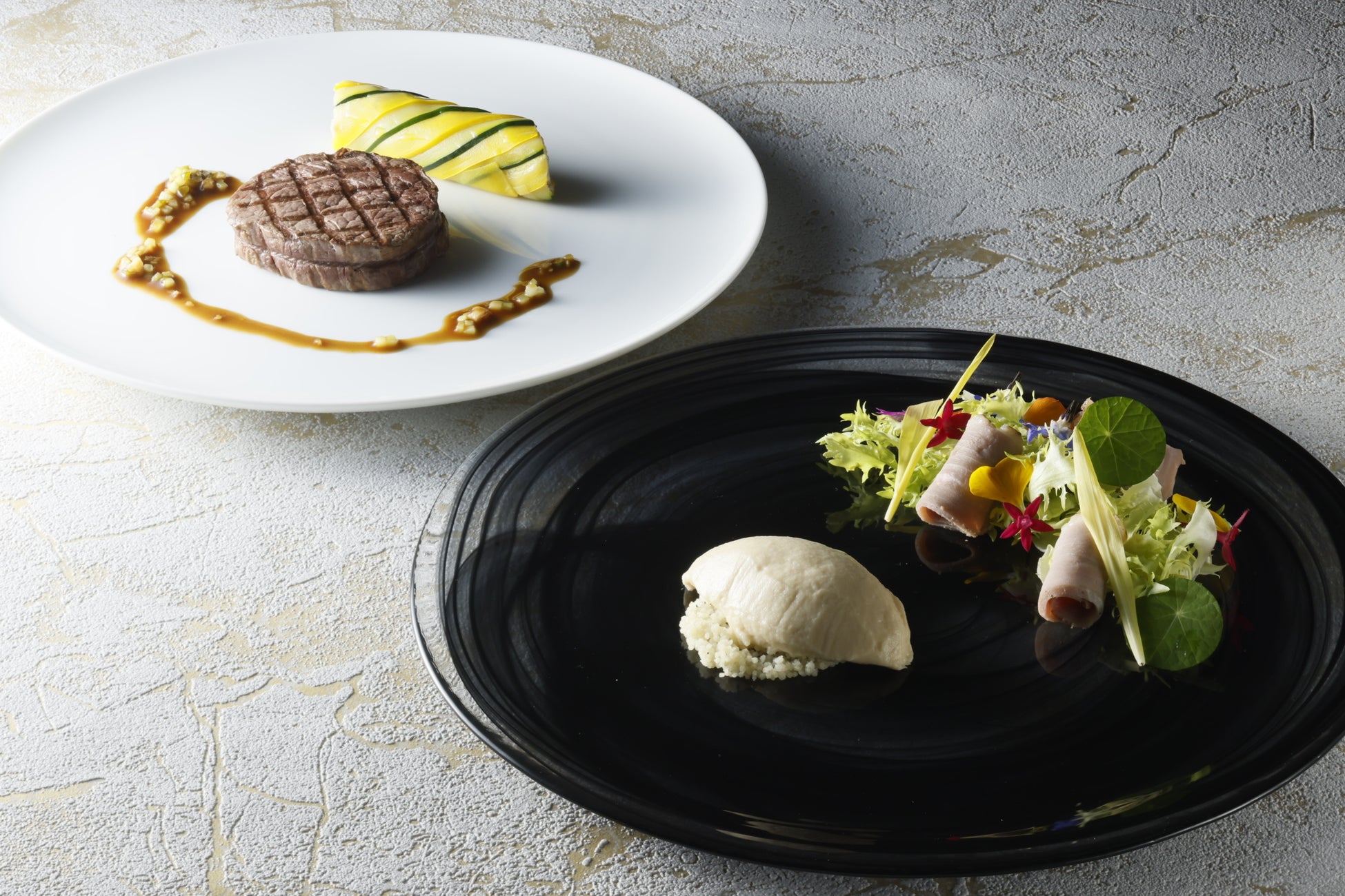 手前より:前菜、肉料理